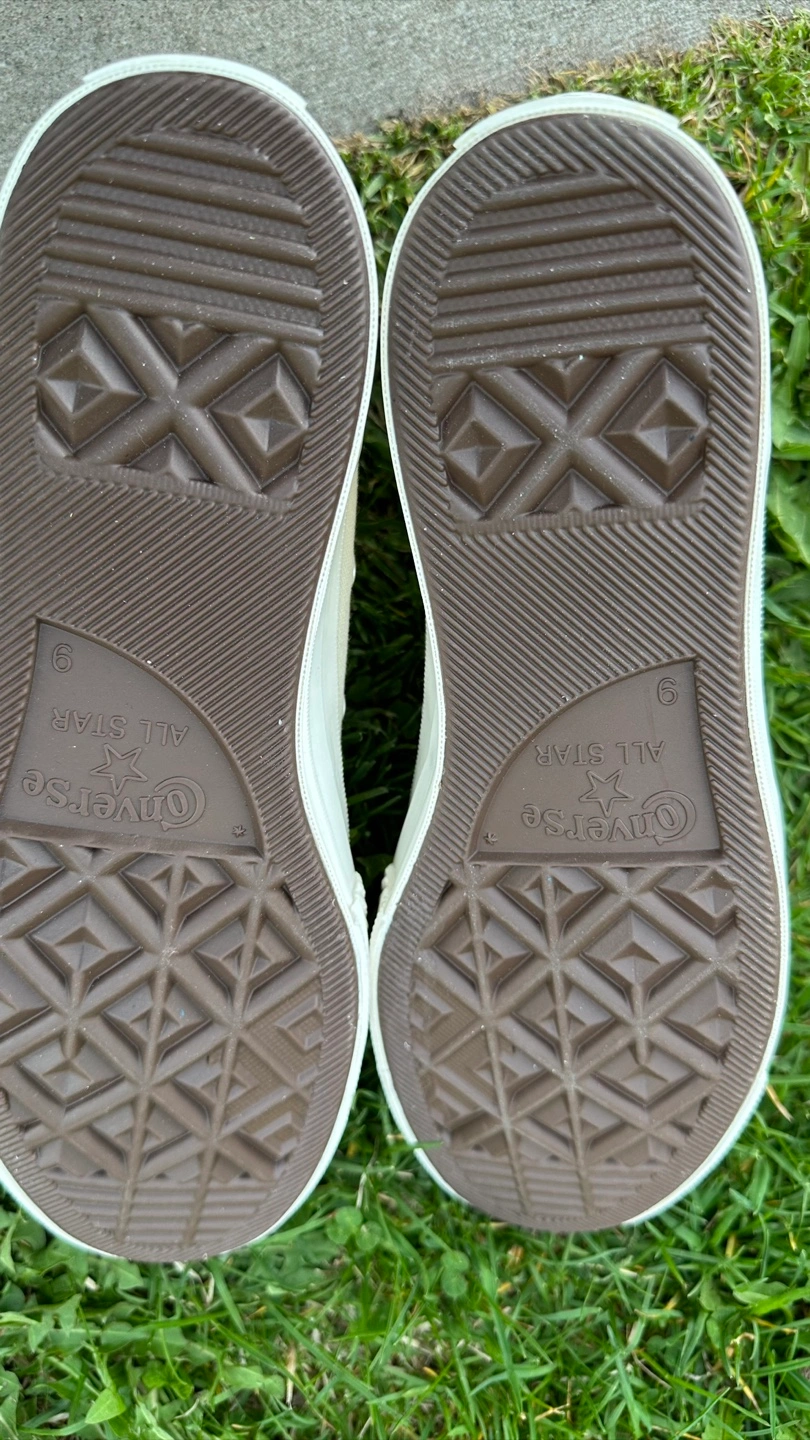 Cream-coloured high-top sneakers. Features a red heart PLAY logo. Size US Men's 9, Women's 11.