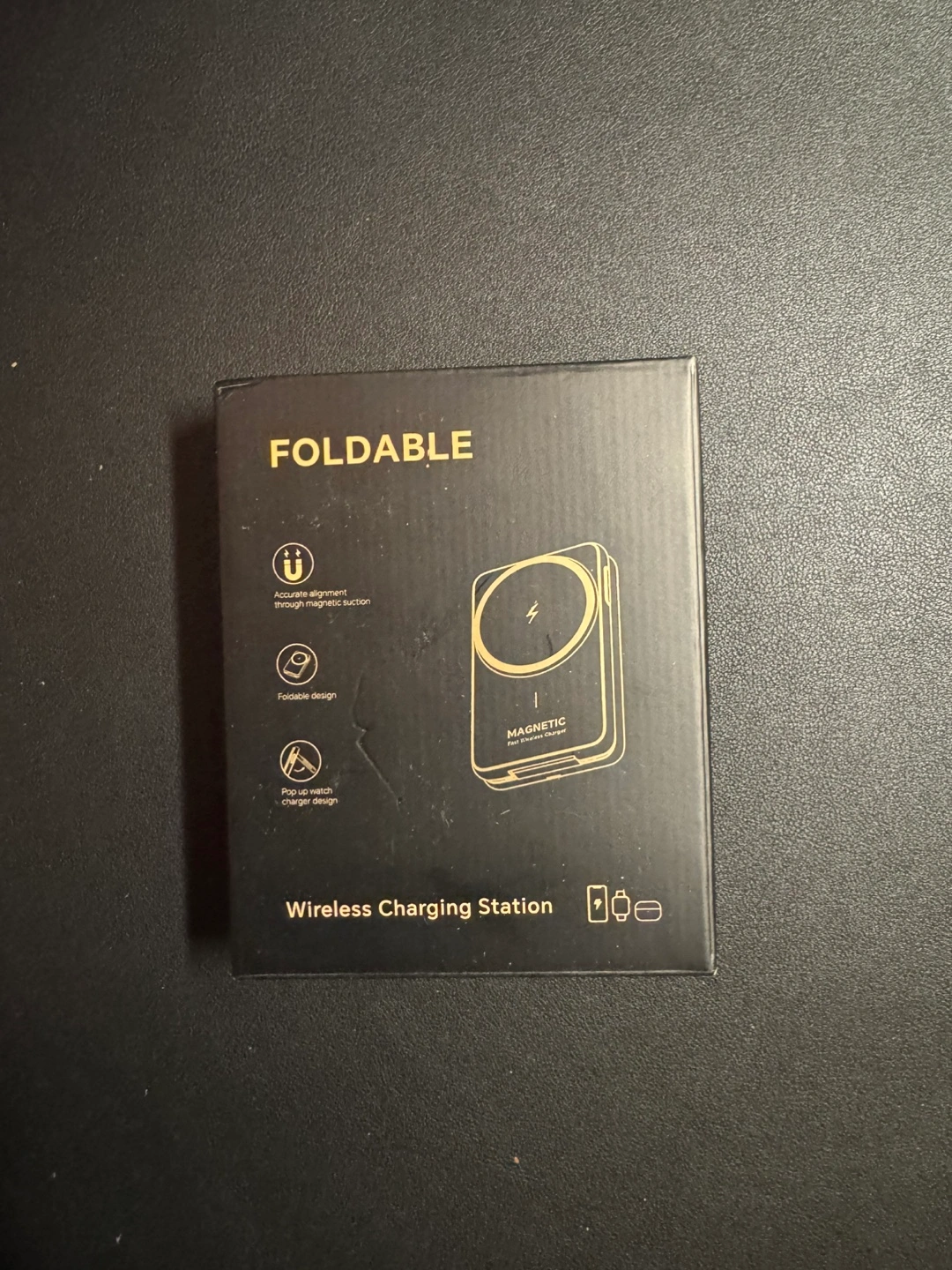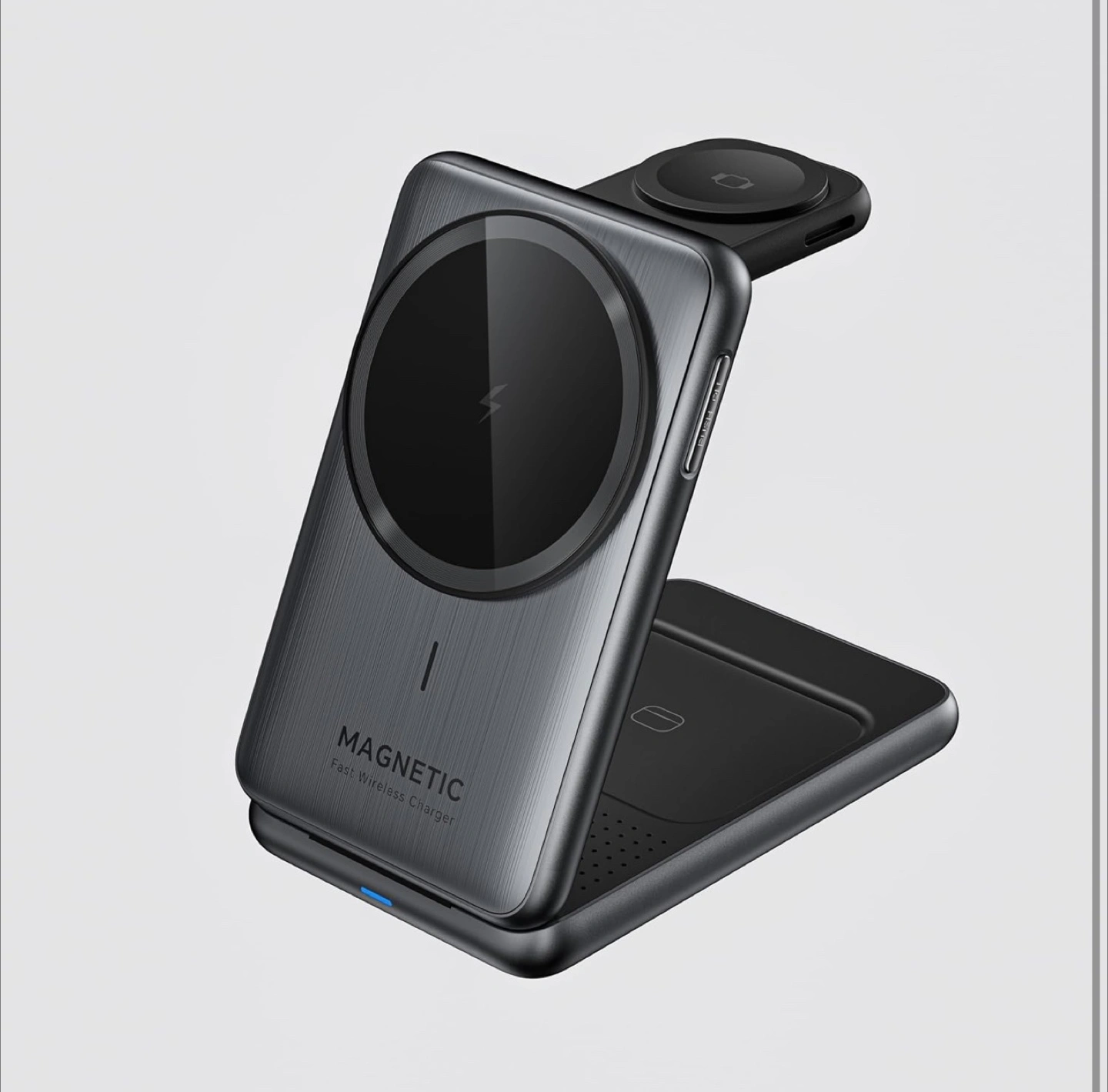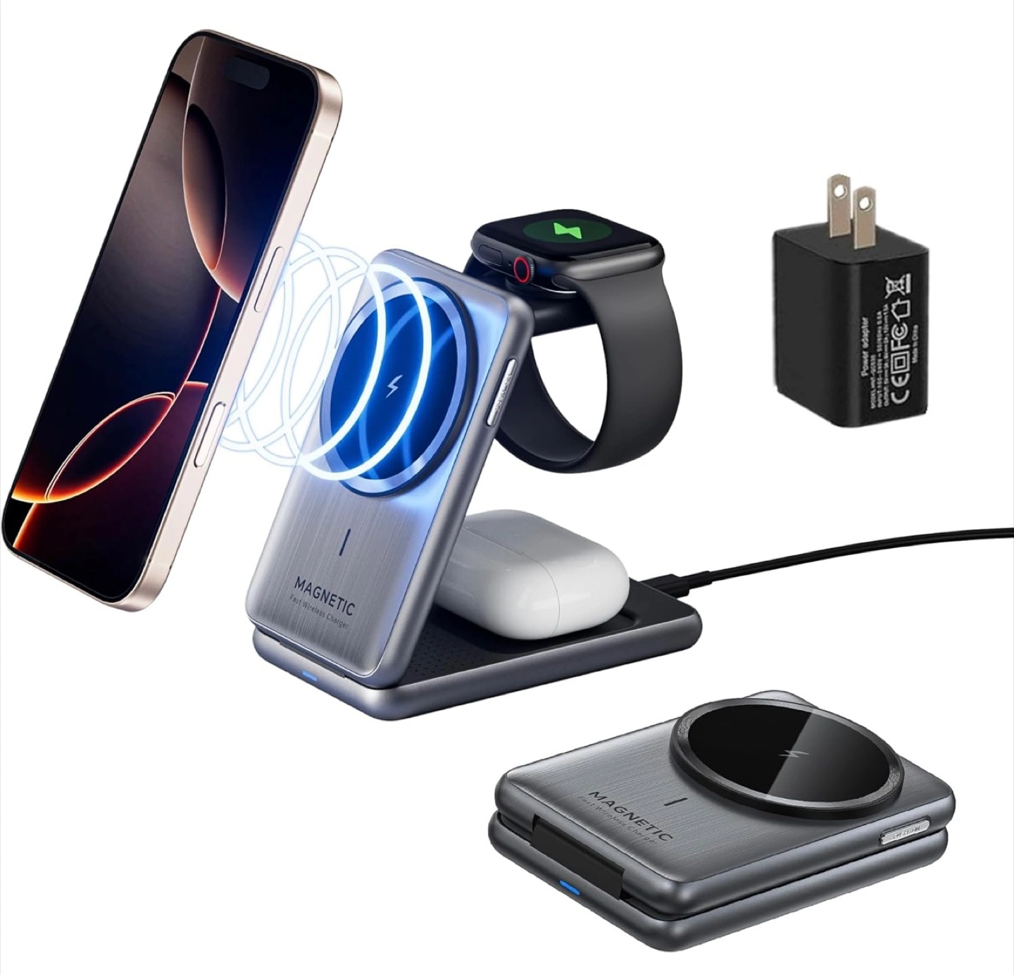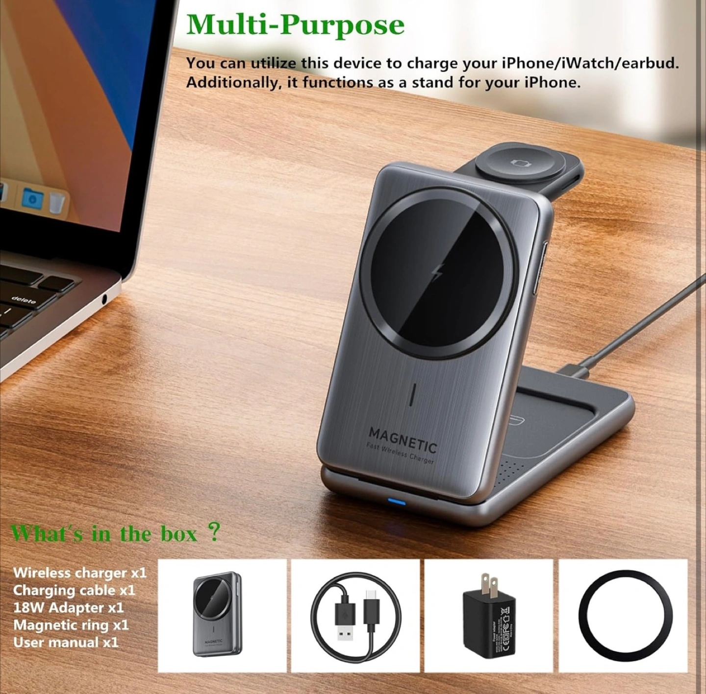 Foldable wireless charger. Charges iPhone, Apple Watch, and AirPods simultaneously. Includes 18W adapter and charging cable. Sleek, portable design. Excellent condition.