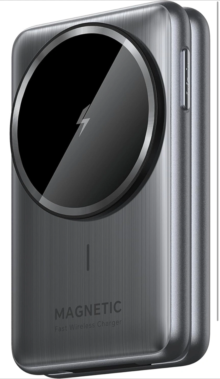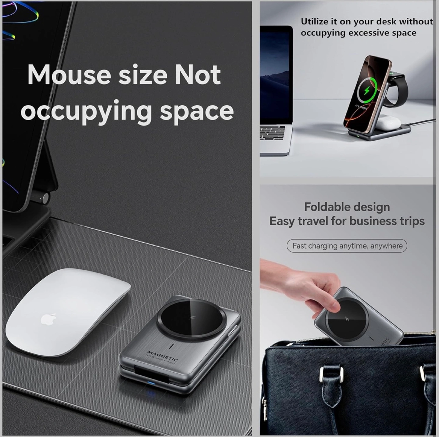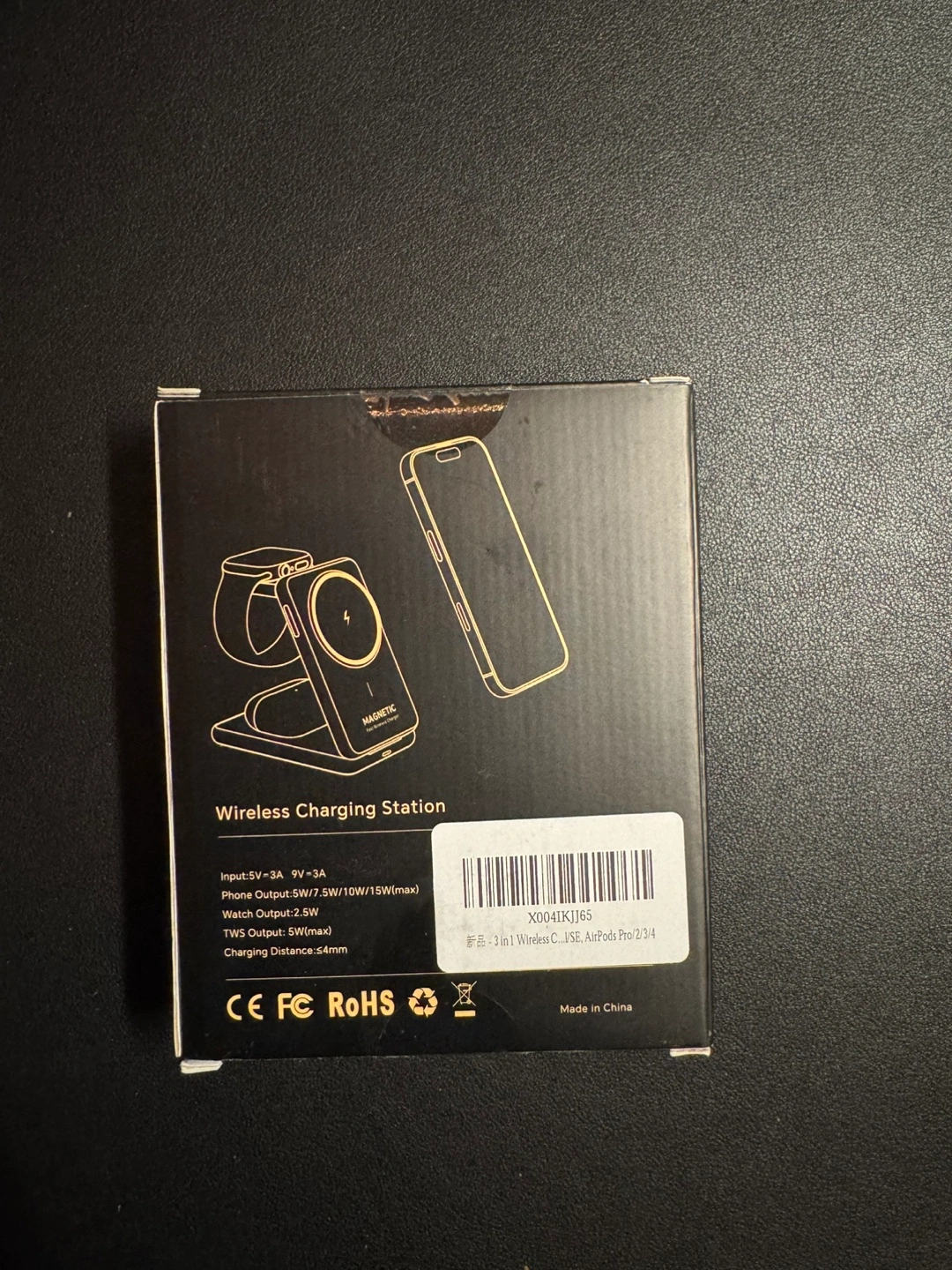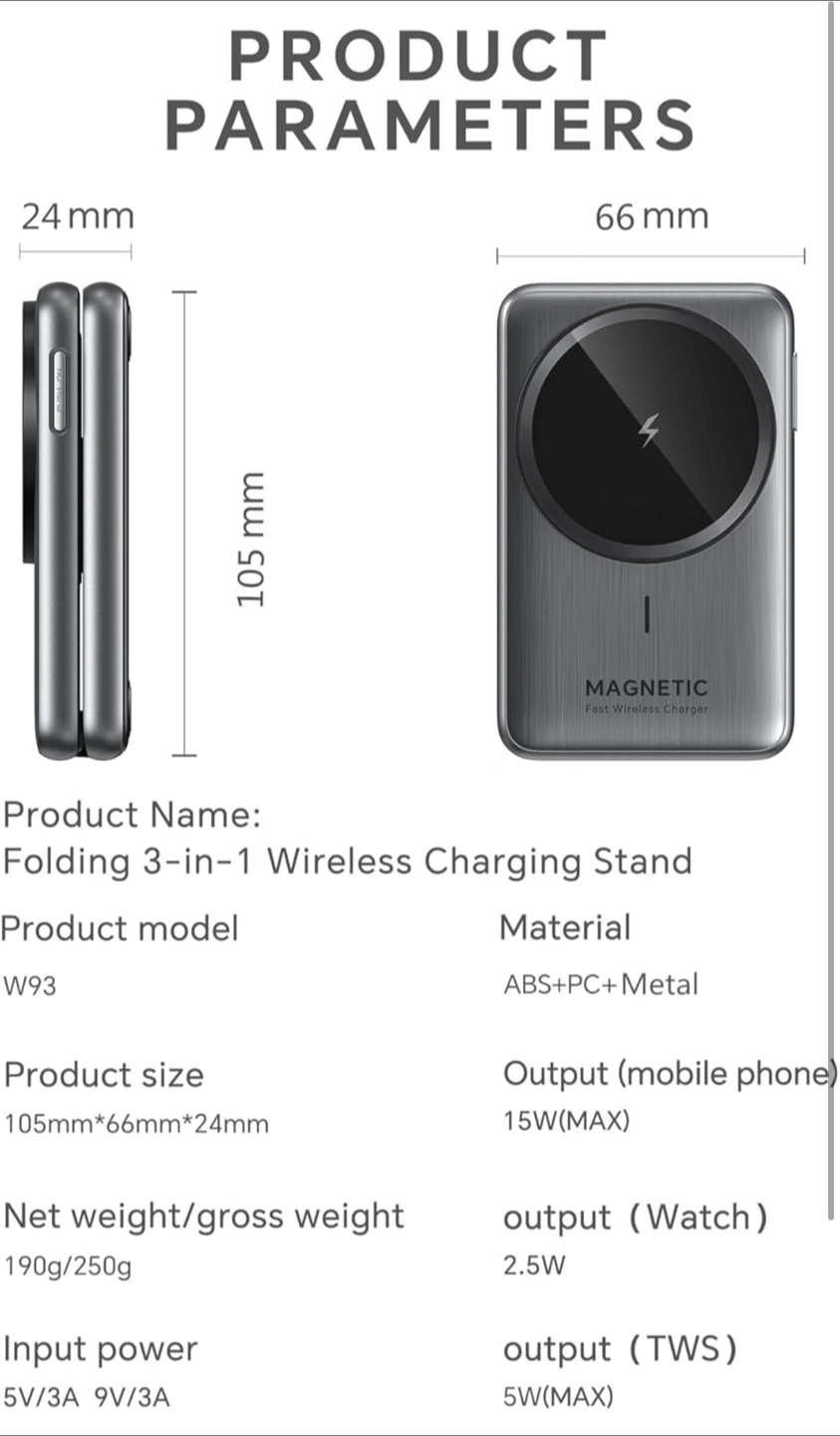 Foldable wireless charger. Charges iPhone, Apple Watch, and AirPods simultaneously. Includes 18W adapter and charging cable. Sleek, portable design. Excellent condition.
