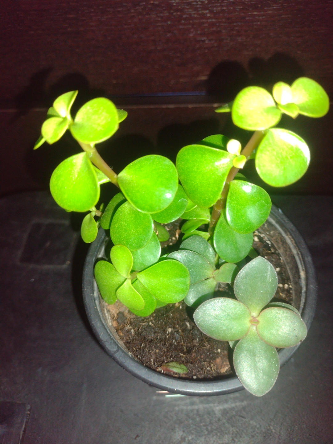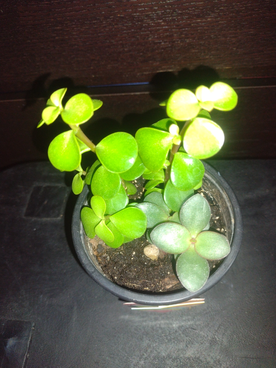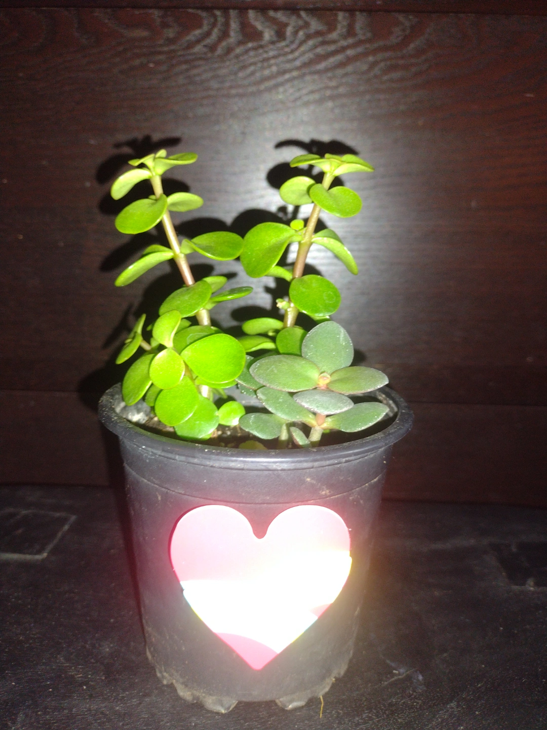 Small potted jade plant. Two different types of jade plants. Heart-shaped sticker on the pot. Great for home or office.
