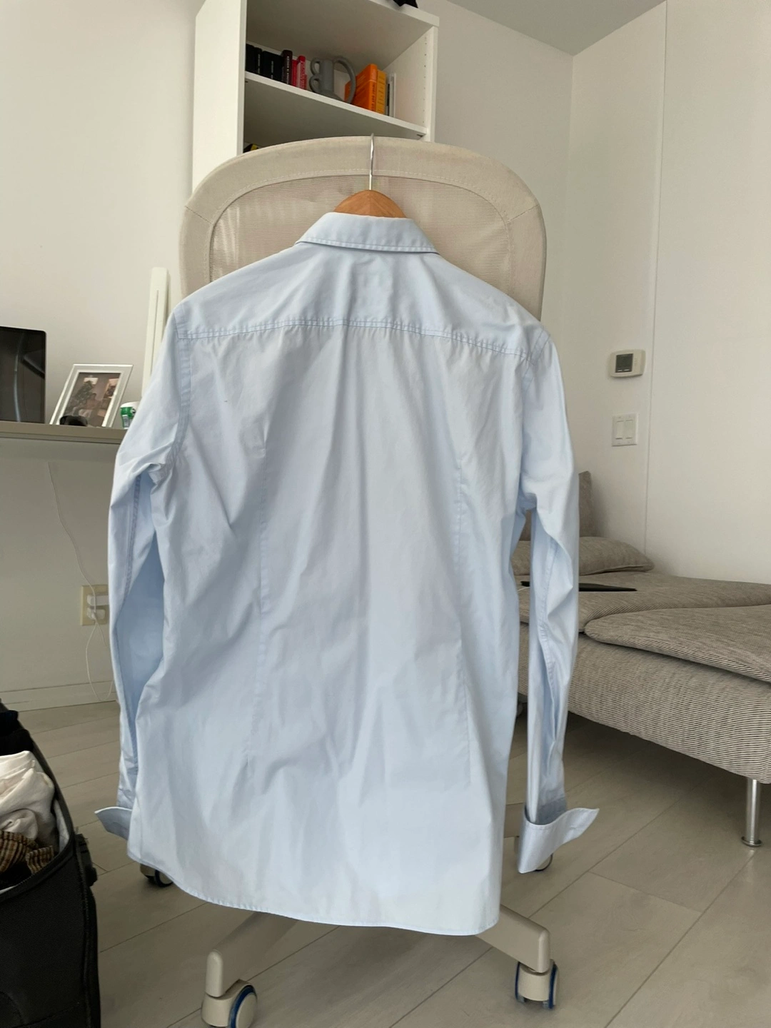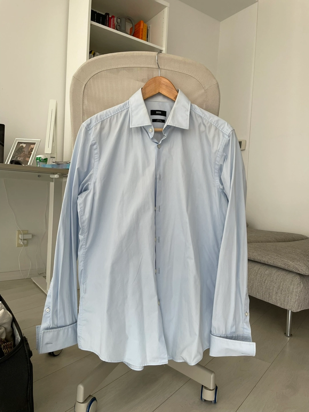 Men's light blue long-sleeved dress shirt. French cuffs. Excellent condition. Size 41