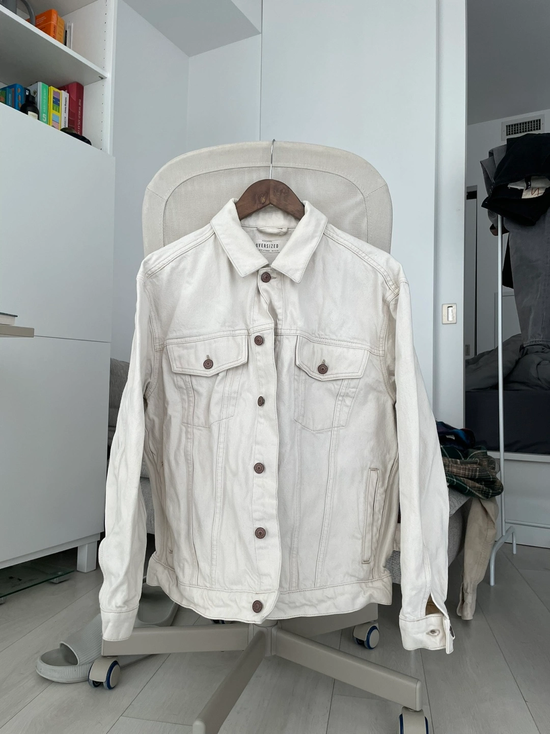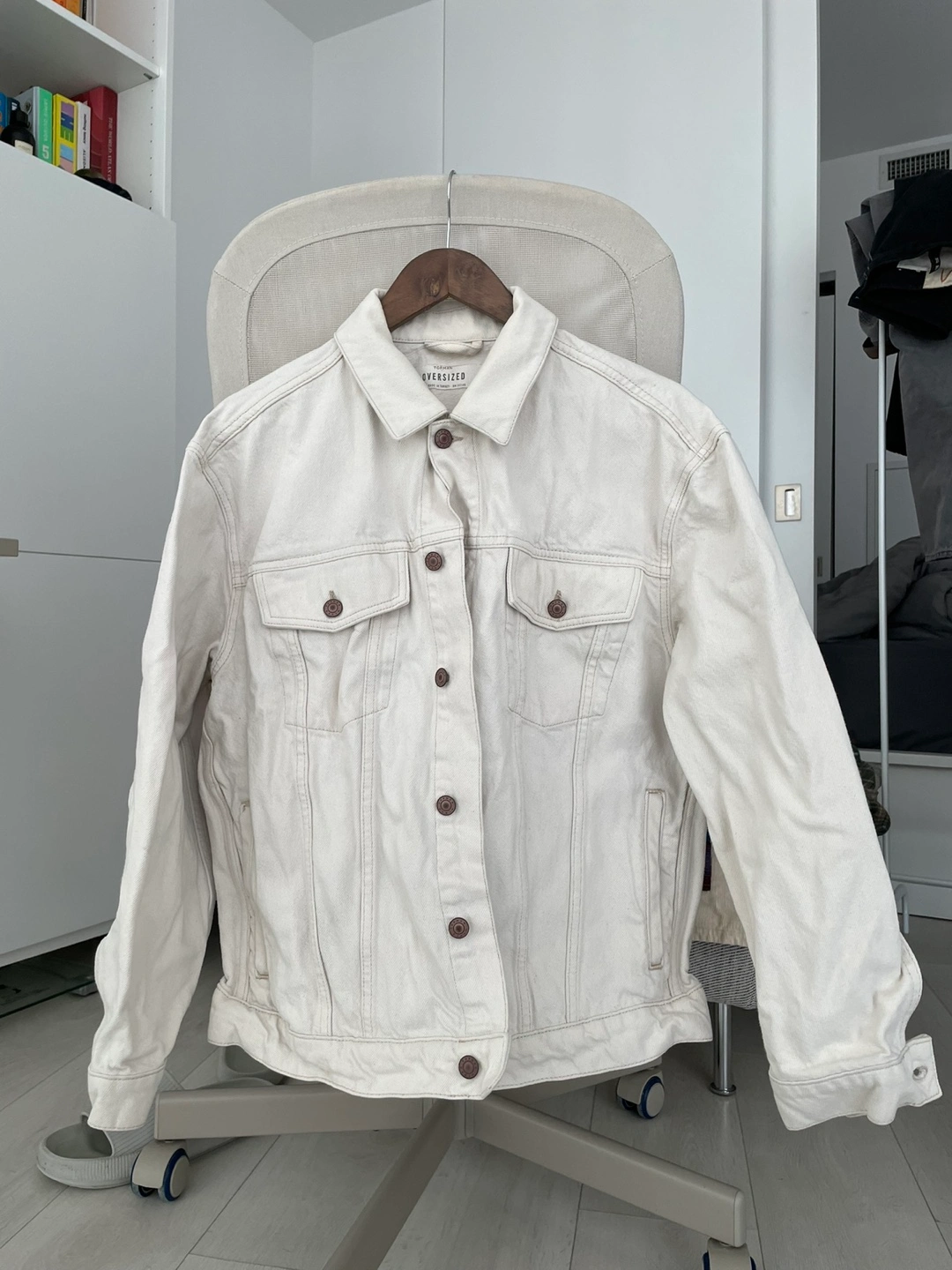 Off-white denim jacket. Features a button closure and chest pockets. Back features various words printed. Long sleeves.