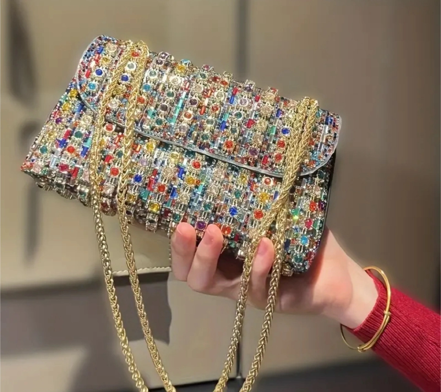 56Gorgeous crossbody bag. Covered in colourful crystals. Gold chain strap. Perfect for evening events.