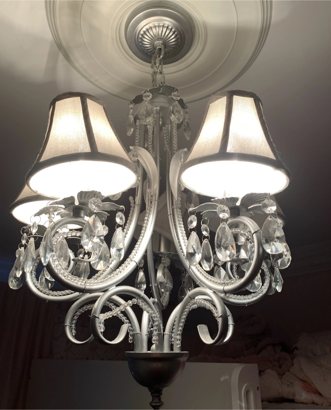 99Elegant silver chandelier. Features three shades and crystal accents. Beautiful addition to any room or nursery.