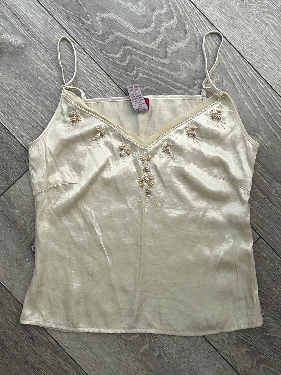 Beautiful champagne coloured cami top. Features delicate bead and shell embellishments in silky smooth fabric. Lightweight and perfect for layering. There are many ways to style this intricate timeless piece!