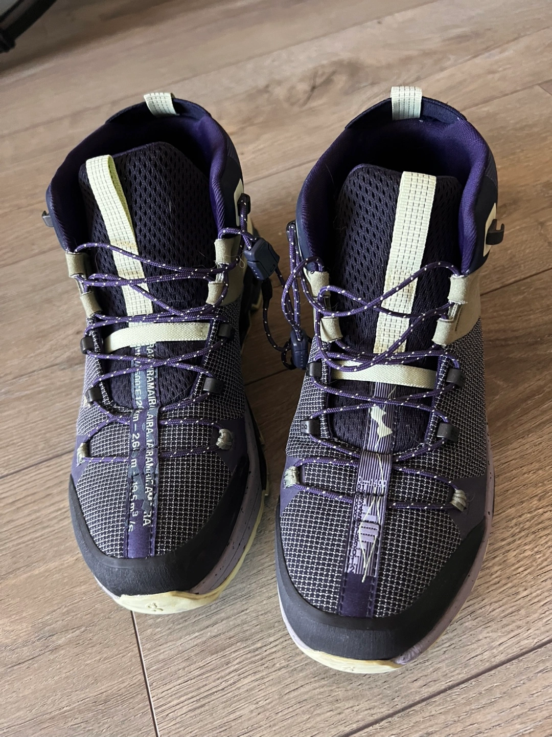 Pair of On Cloudrock waterproof hiking boots. Durable construction. Grey, purple, and beige colour scheme. Excellent traction.