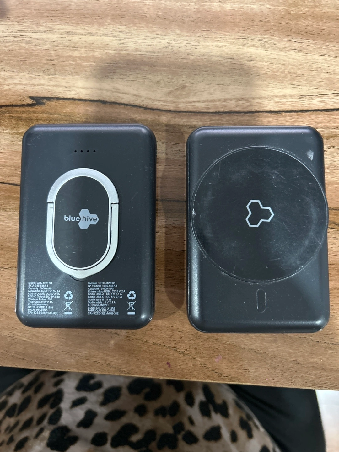 Two BluHive portable chargers. One features a built-in phone ring holder. Both have multiple USB ports. Good for travel and wireless.