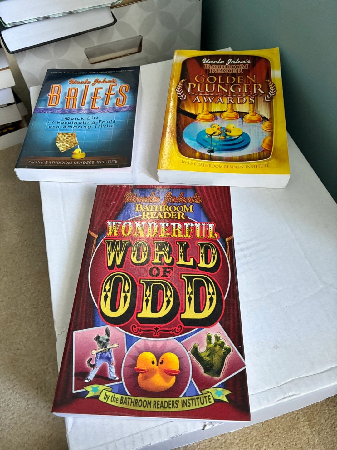 32Set of three books from the Uncle John's Bathroom Reader series. Titles include Briefs, Golden Plunger Awards, and Wonderful World of Odd. Quick facts and trivia.