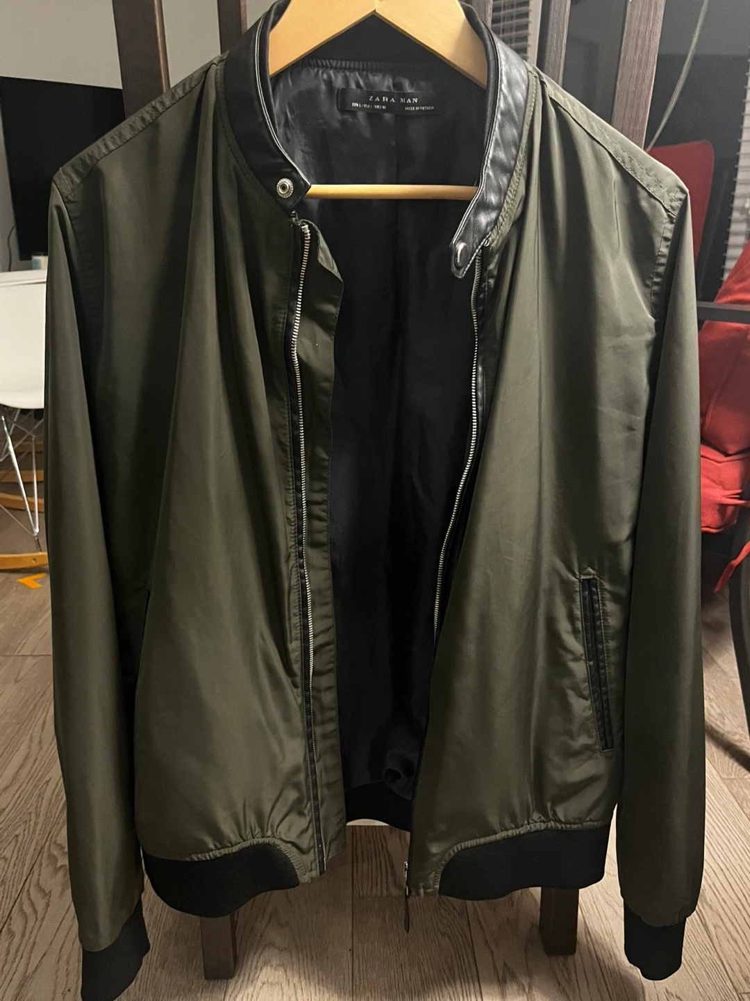 44ZARA Man bomber jacket in a sleek olive green with black ribbed cuffs and hem. Faux leather trim around the collar for a bold, modern touch. Lightweight and perfect for spring or fall. Size Medium. Gently worn, in excellent condition with no stains or damage. Pickup in Burnaby. Price is negotiable—open to bundling with other jackets for a deal!