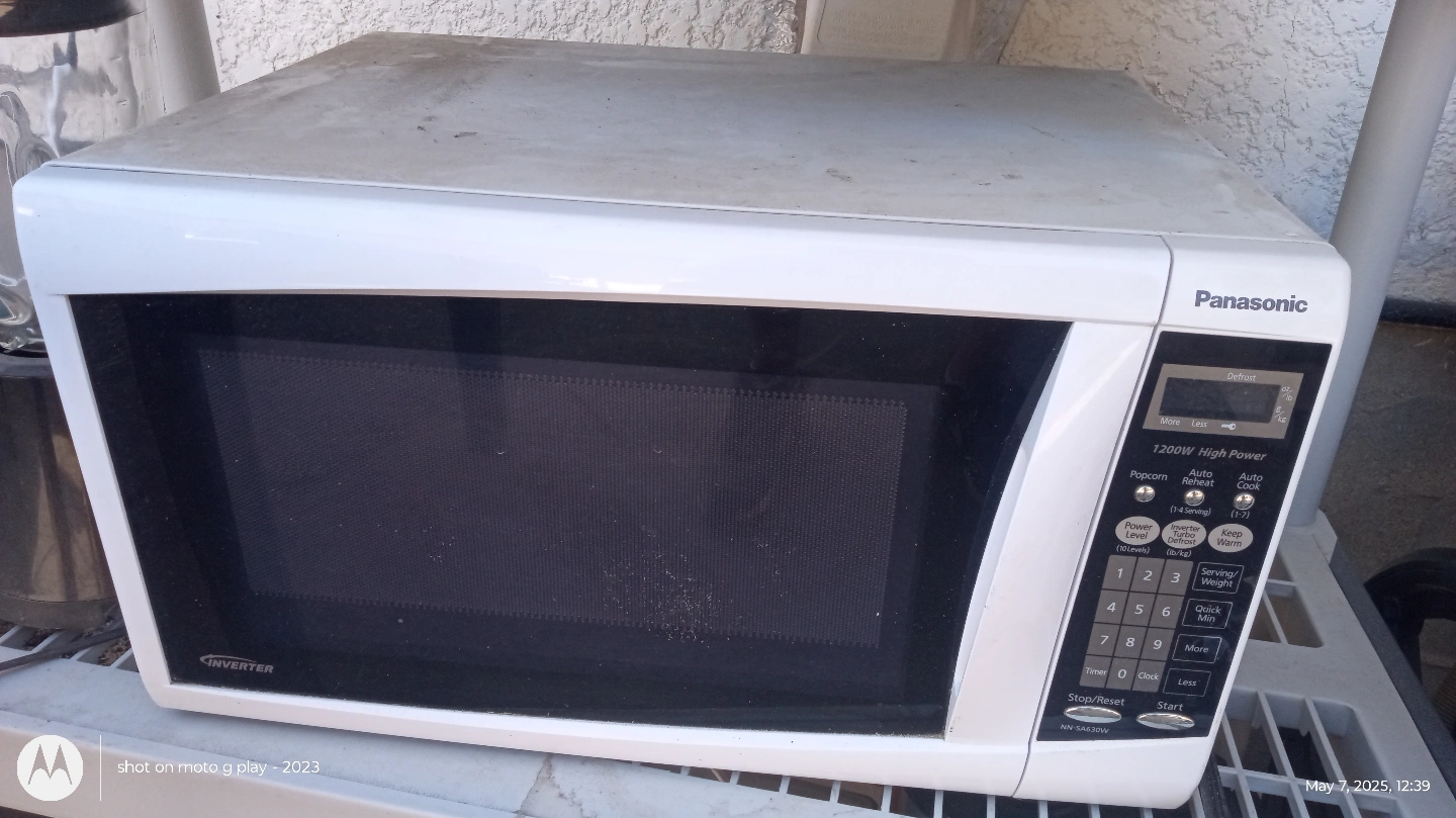 White Panasonic microwave. 1200W high power. Features auto cook, reheat, popcorn, and defrost functions. Inverter technology. Number pad and various settings.