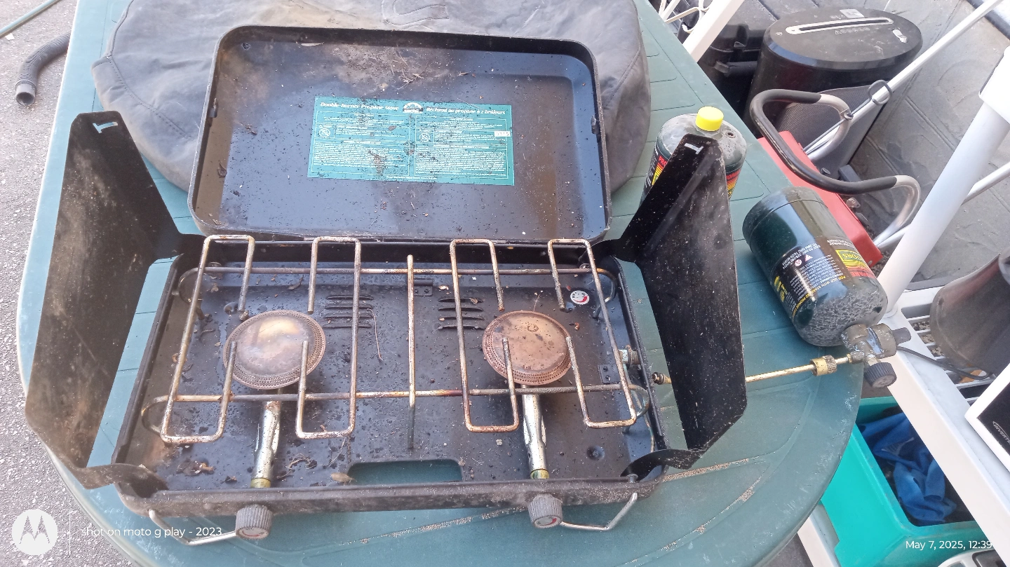 Used double burner camping stove. Shows signs of use. Includes carrying case. Two burners. Portable. 2 propane tank included.
