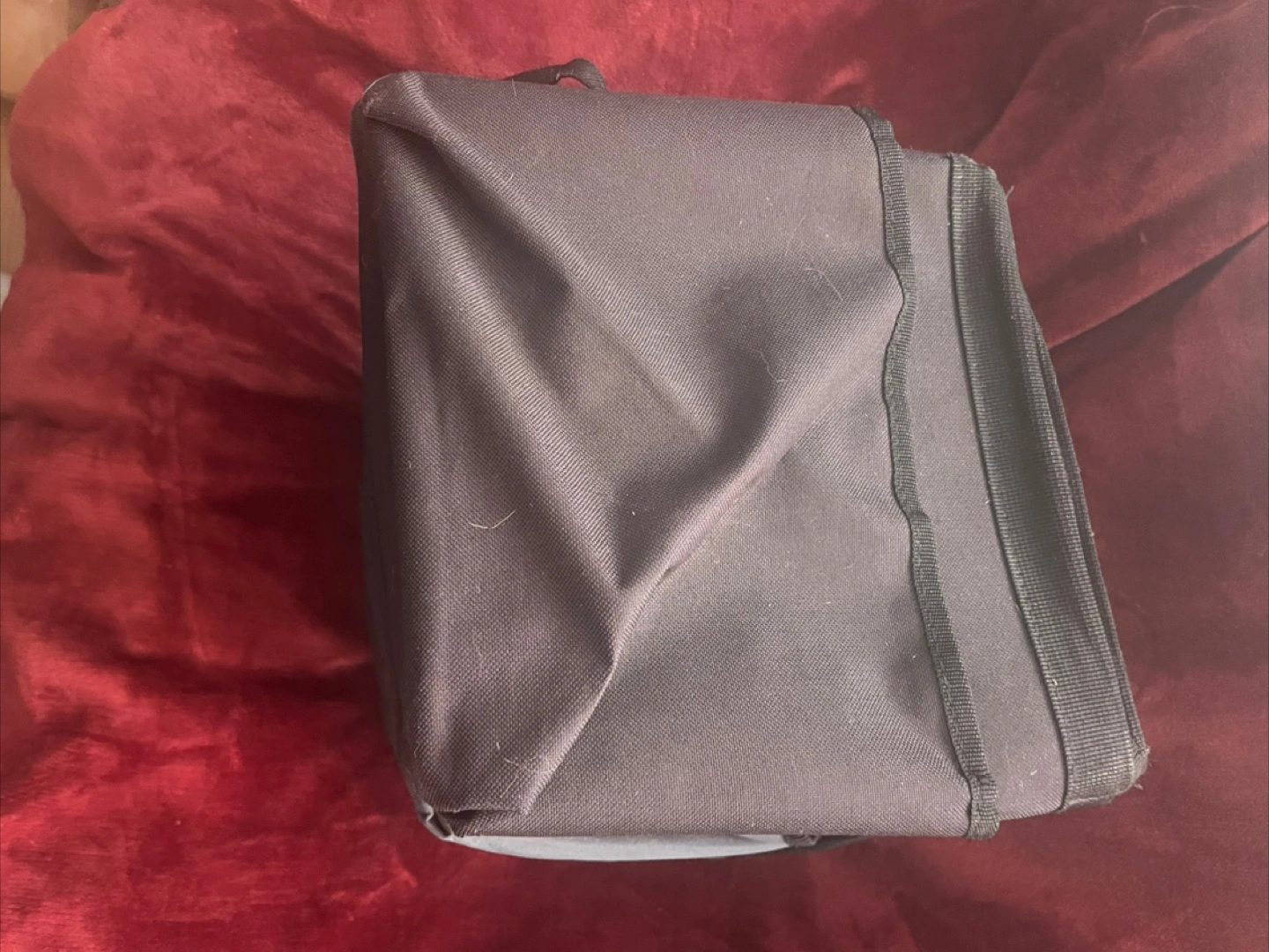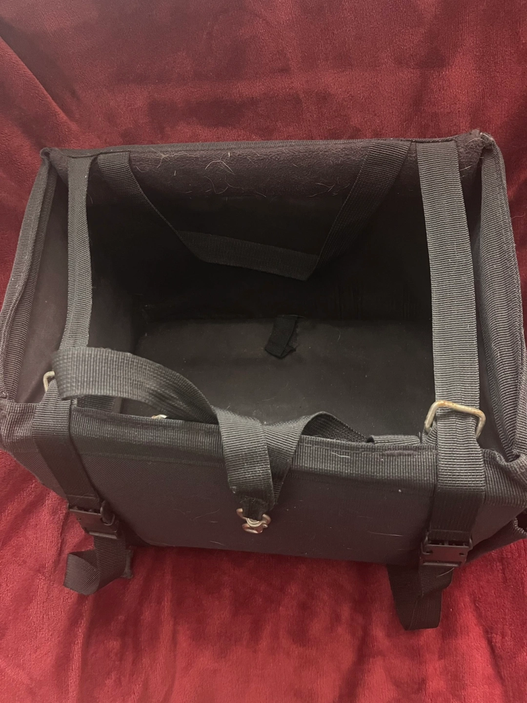 Small black pet carrier. Features adjustable straps and a small mesh pocket. Suitable for small animals…..like