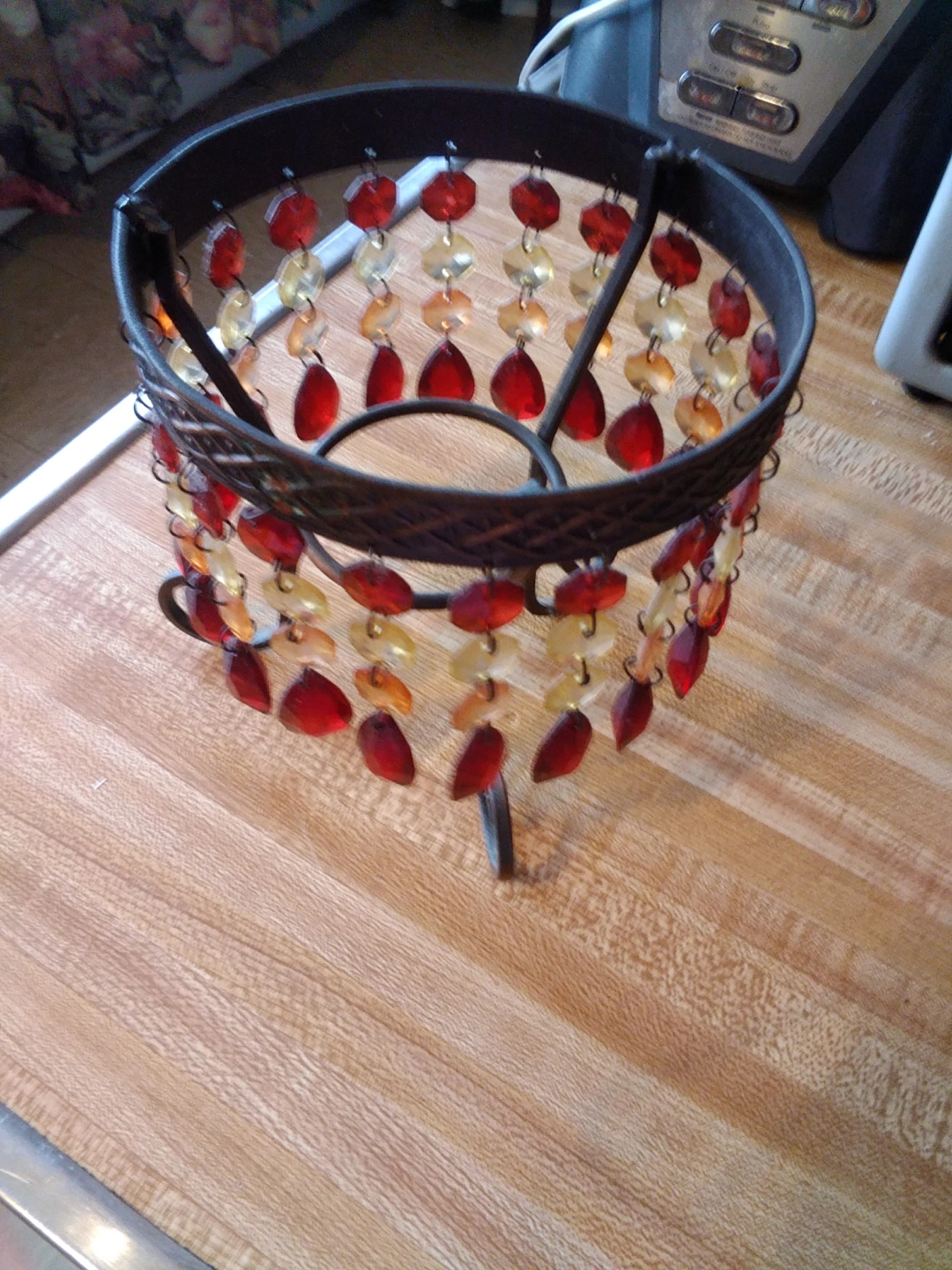 620Metal candle holder. Red and amber glass beads. Unique design. Decorative.