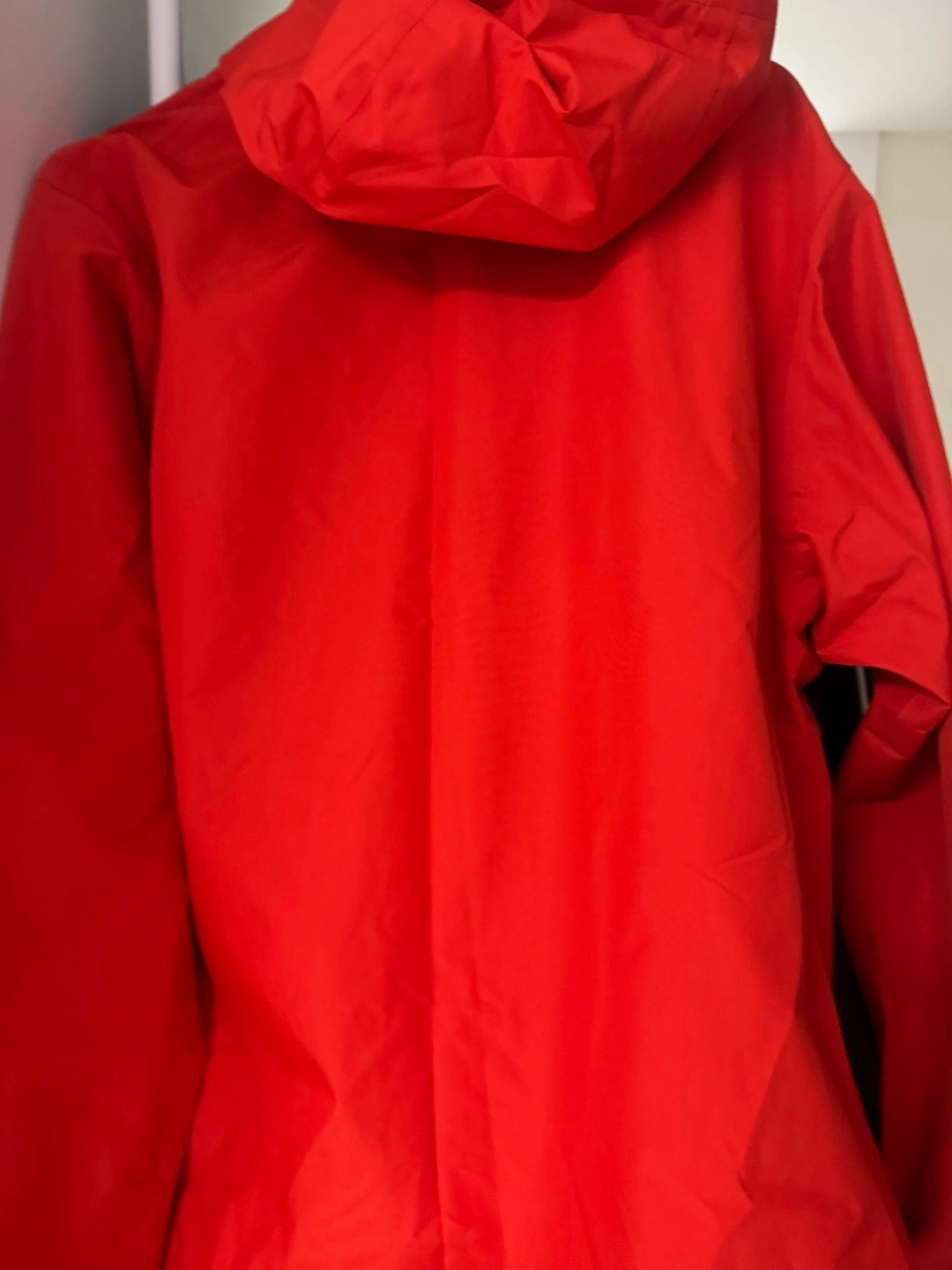 89Lightweight red Helly Hansen jacket. Features a hood and zipper closure. Great for layering or wearing on its own.