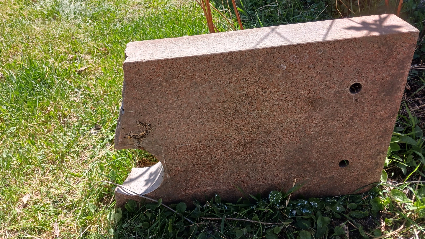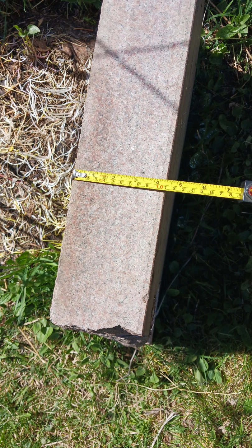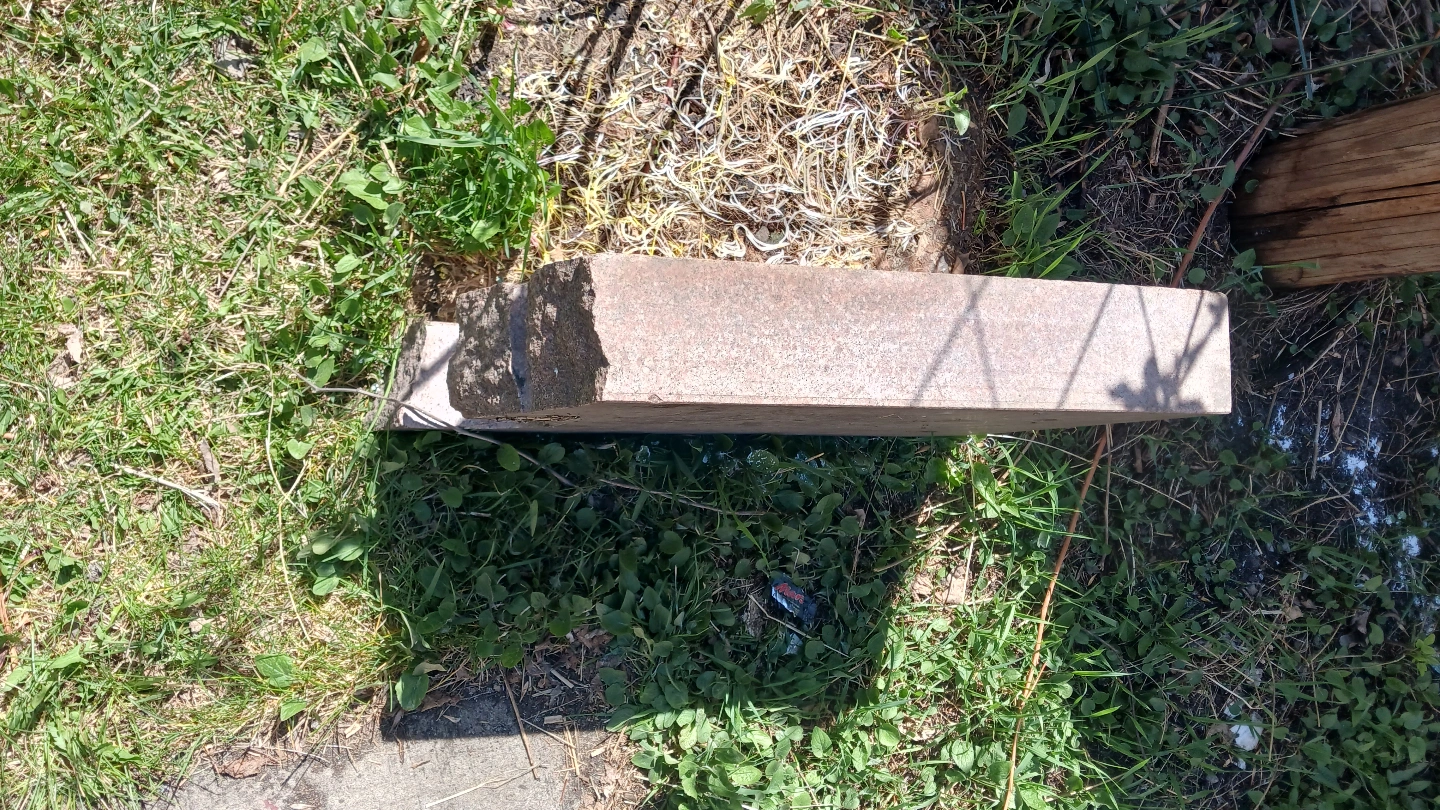Large granite stone block, ideal for landscaping or garden feature. Shows some wear. Approximately 100 pounds, maybe more. Two holes present.