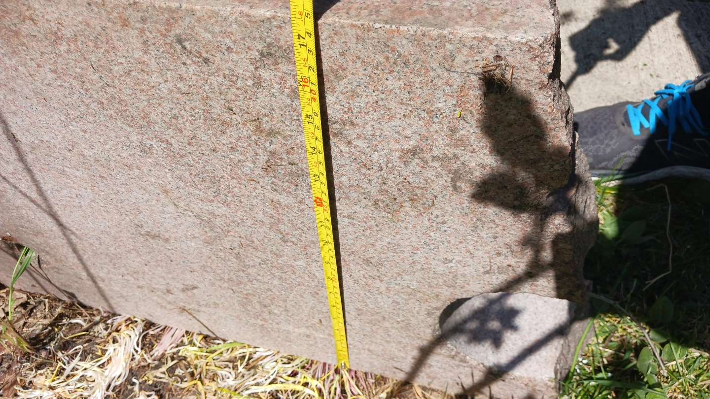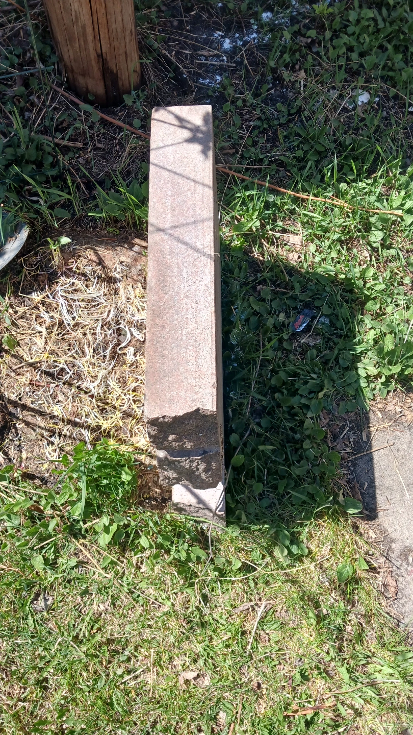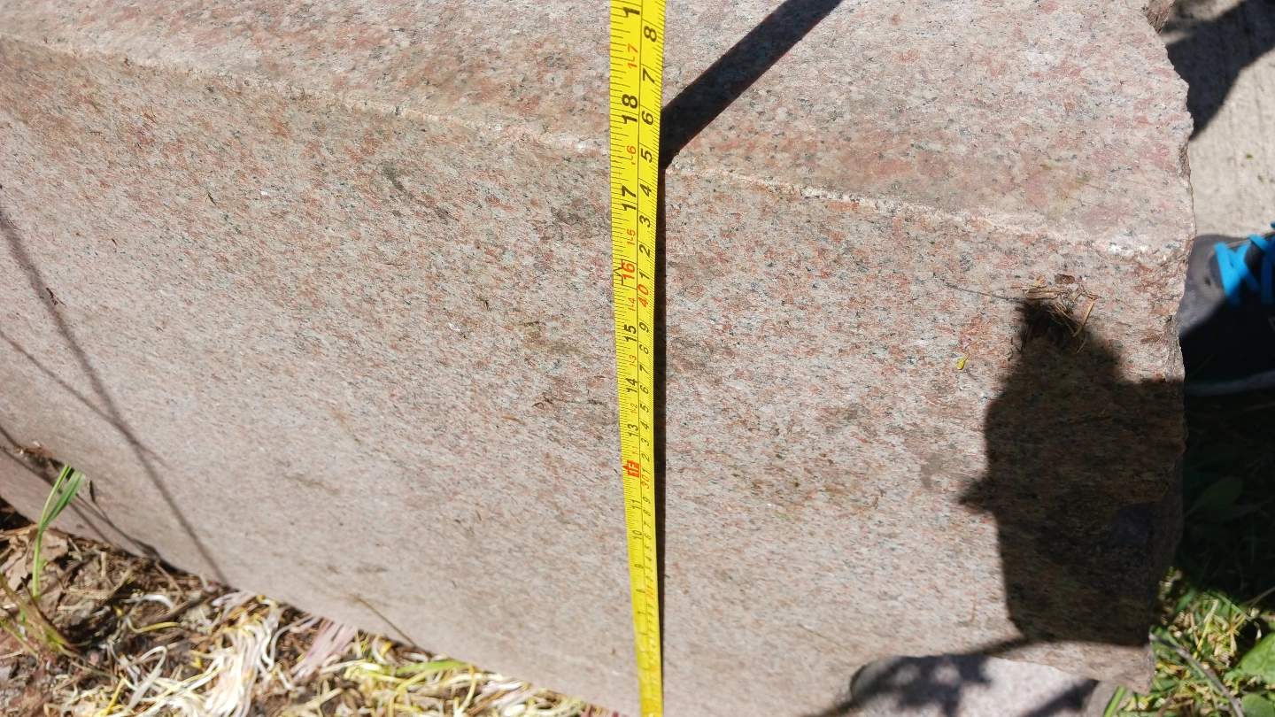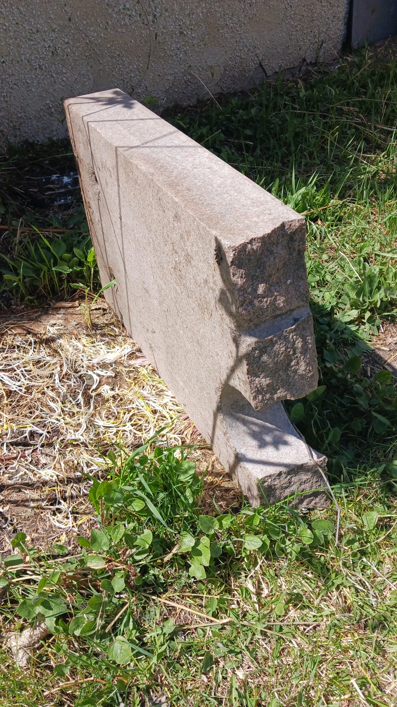 Large granite stone block, ideal for landscaping or garden feature. Shows some wear. Approximately 100 pounds, maybe more. Two holes present.