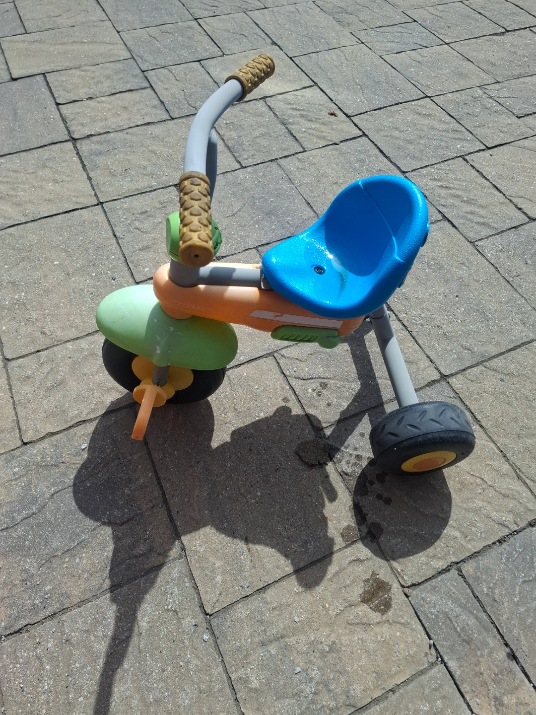 18Little Tikes toddler tricycle. Features a blue seat and orange, green, and grey body. Wheels are black with yellow centres. Used condition.