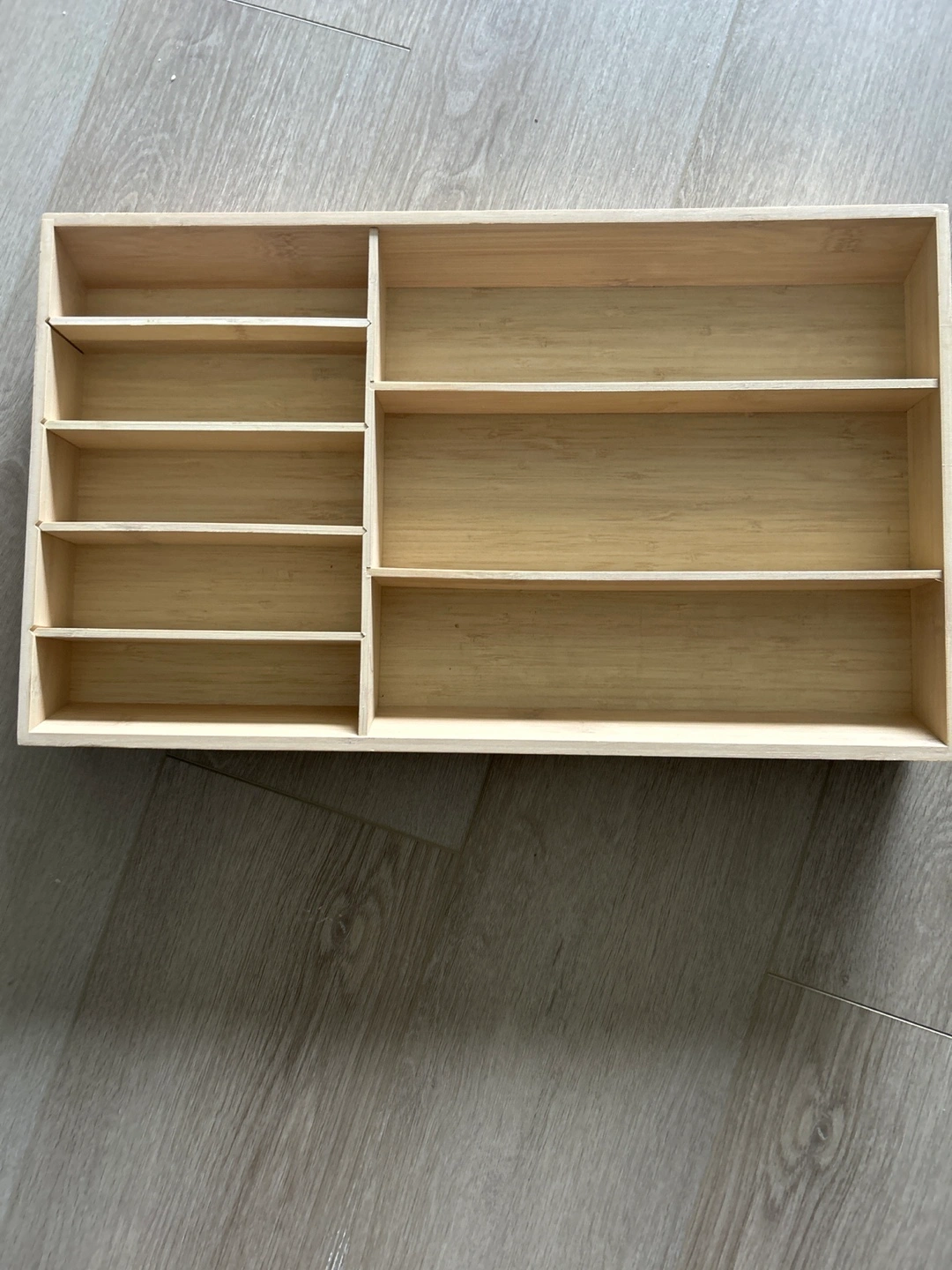 Wooden drawer organizer. Multiple compartments. Great for cutlery or other small items. Light coloured bamboo. You can adjust the size by taking the dividers