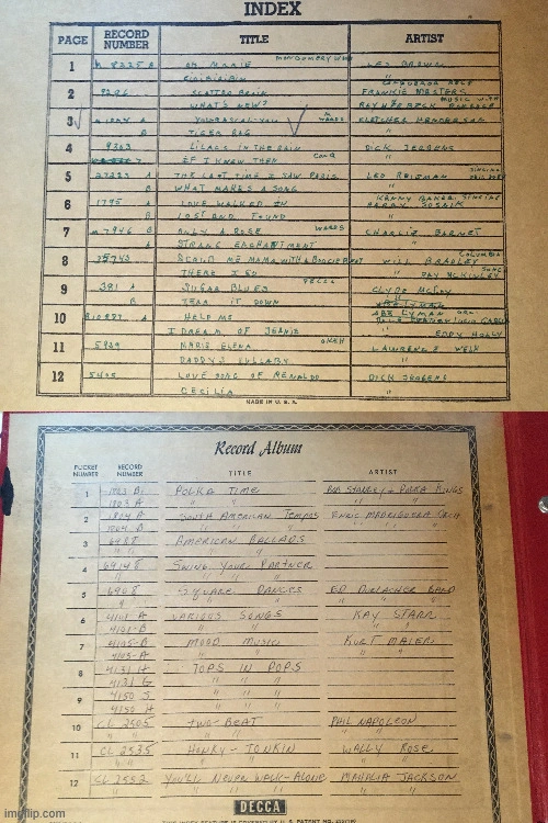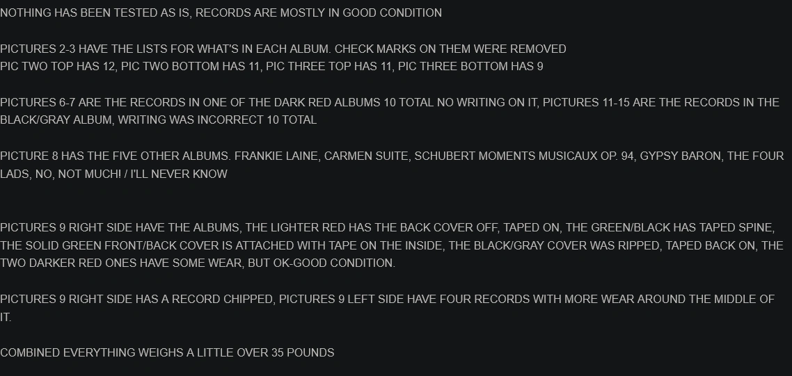 Collection of vintage 78 RPM record albumsand lps. Includes several albums with handwritten indexes. Records from various artists and labels. Albums show some wear. nothing has been tested as is records are mostly in good condition a few of them have wear marks in the middle. four of the storage books have tape on the spine a couple of the covers were taped back on. last picture for all details. They weigh like 35 lb. pick up at house