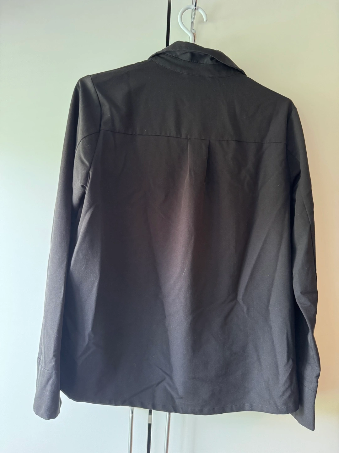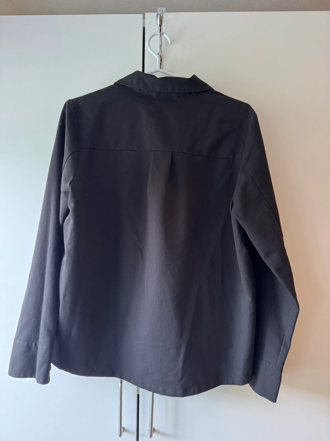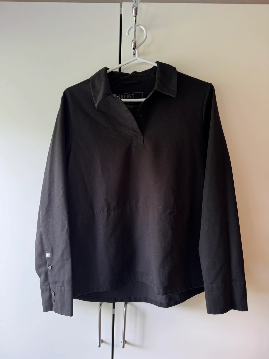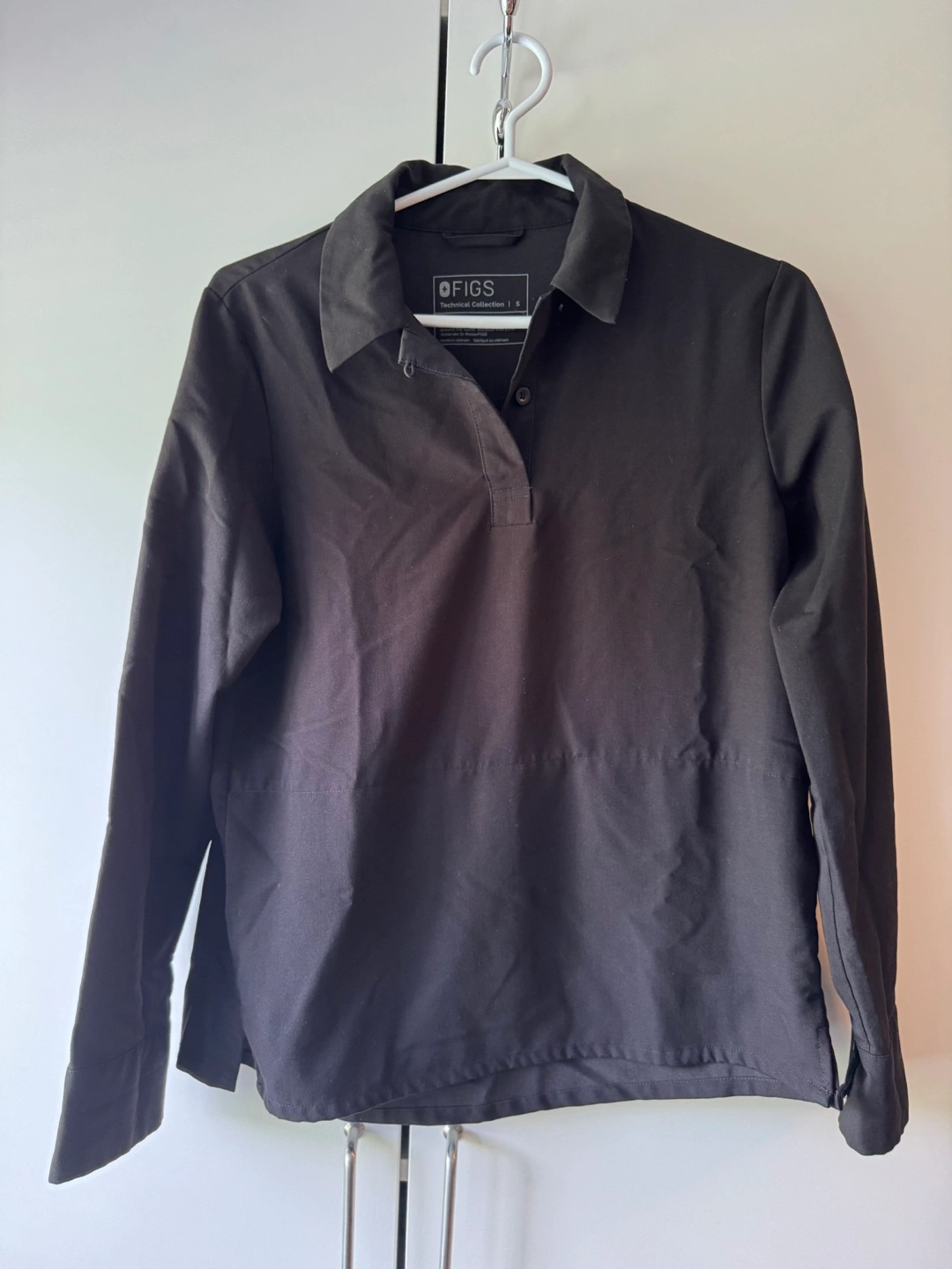 Black long-sleeve collared scrub top. Kangaroo pocket on the front. Available in both small and medium sizes. Can sell separately or together.
