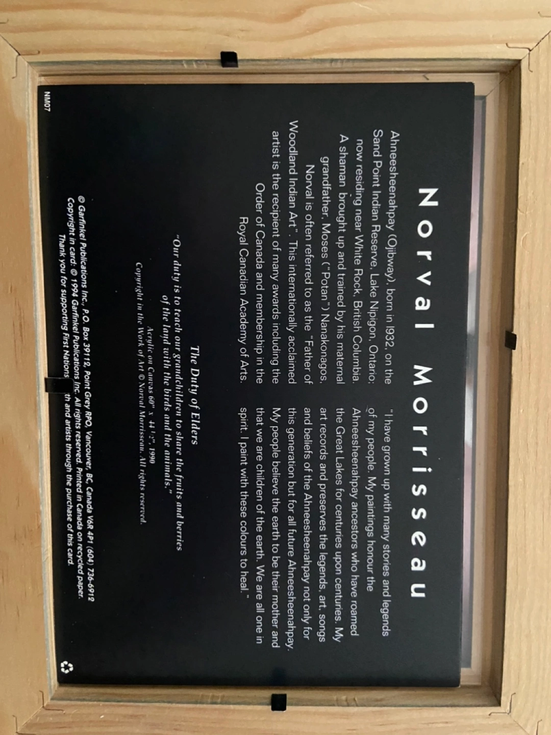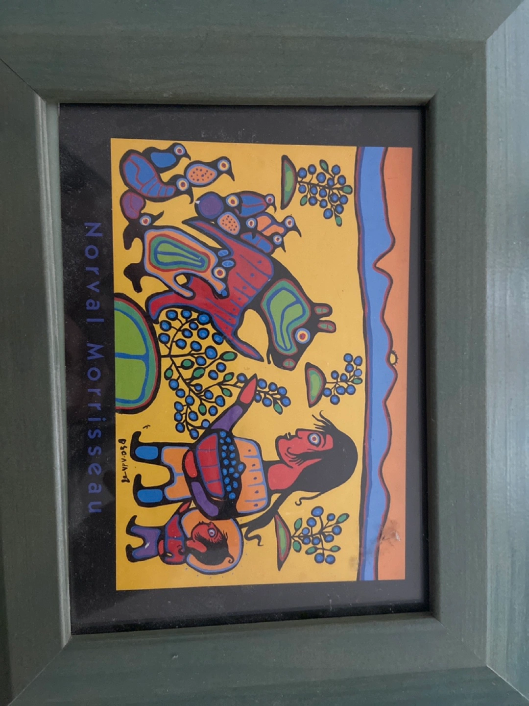 Framed print featuring artwork by Norval Morrisseau. Indigenous art. Bright colours. Small size. Good condition.