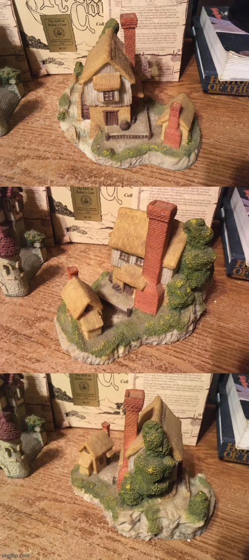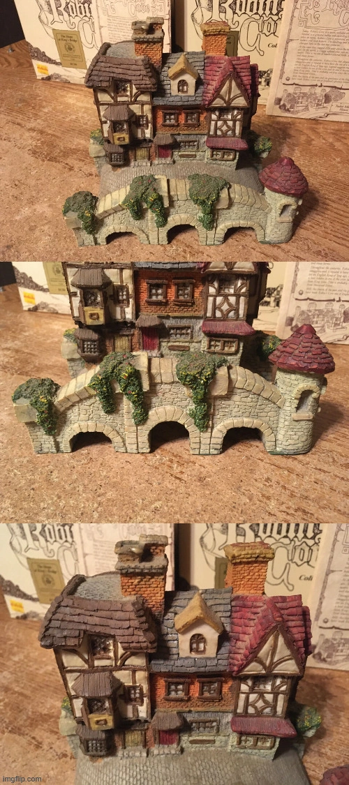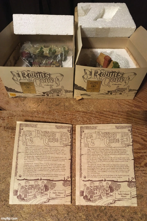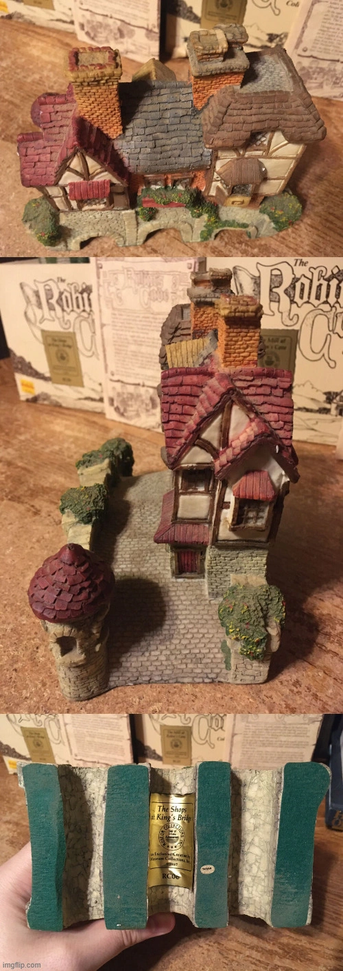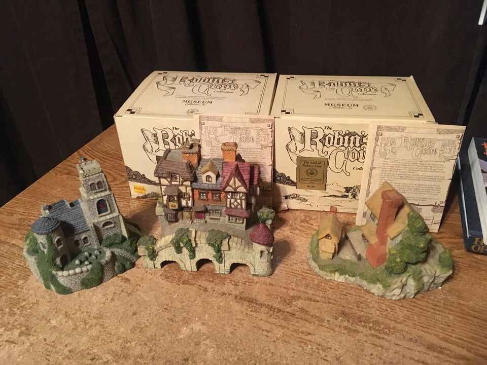 Three Robin's Cove Museum Collection figurines. Includes The Mill at Robin's Cove and the Bridge House. Collectible resin figurines. 1987 museum collections Inc the robins cove collection The Mill at Robin's cove RC 21 has box. 1987 museum collections Inc the robins cove collection the shops at kingsbridge RC 06 has box. 1987 museum collections Inc the Robin's cove collection The country Church an parsonage RC22 no box, picture nine top shows a little piece missing chimney was glued on. Cash only pick up at house