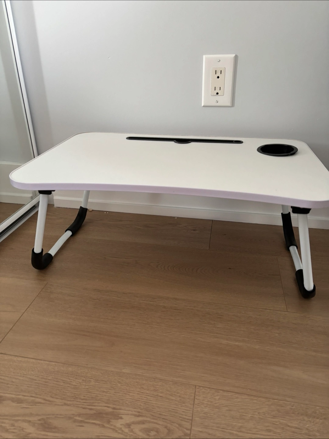 Foldable laptop table. White top with black accents. Features a cup holder and cable organizer. Lightweight and easy to store.