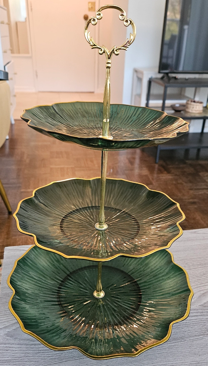 Beautiful three-tiered serving stand. Dark green with gold accents. Perfect for parties or afternoon tea. Features a convenient carrying handle.