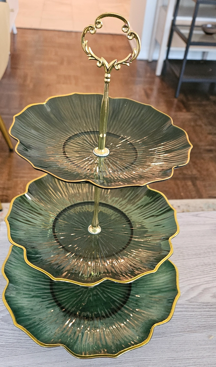 Beautiful three-tiered serving stand. Dark green with gold accents. Perfect for parties or afternoon tea. Features a convenient carrying handle.