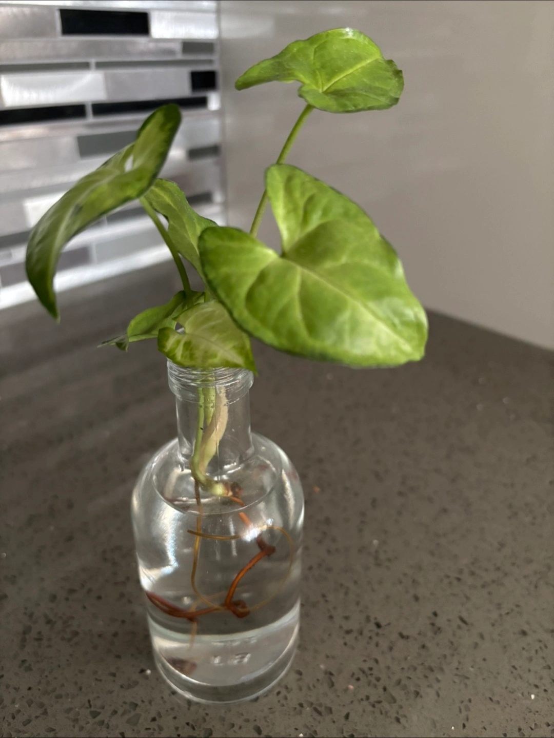 Philodendron Gloriosum cutting propagating in water. Healthy roots developing. Small glass bottle included.