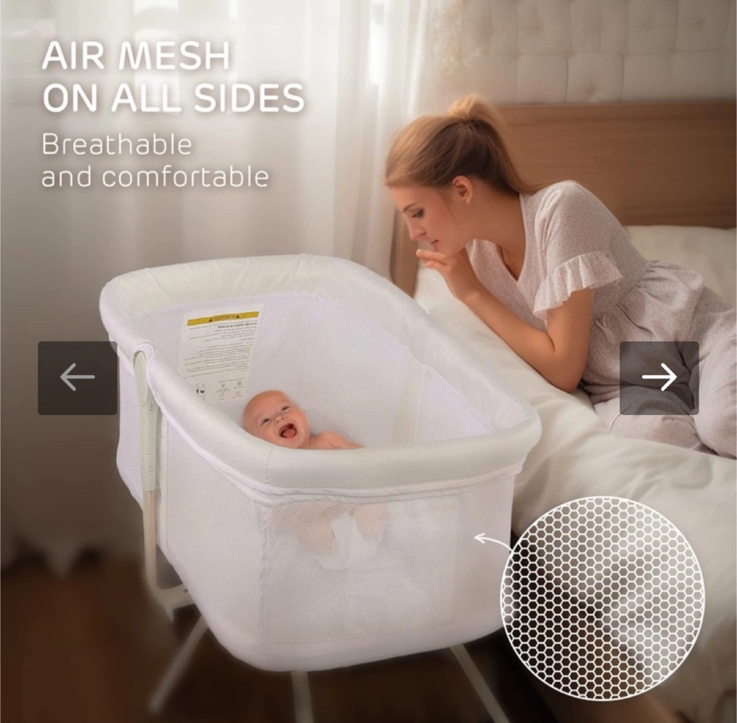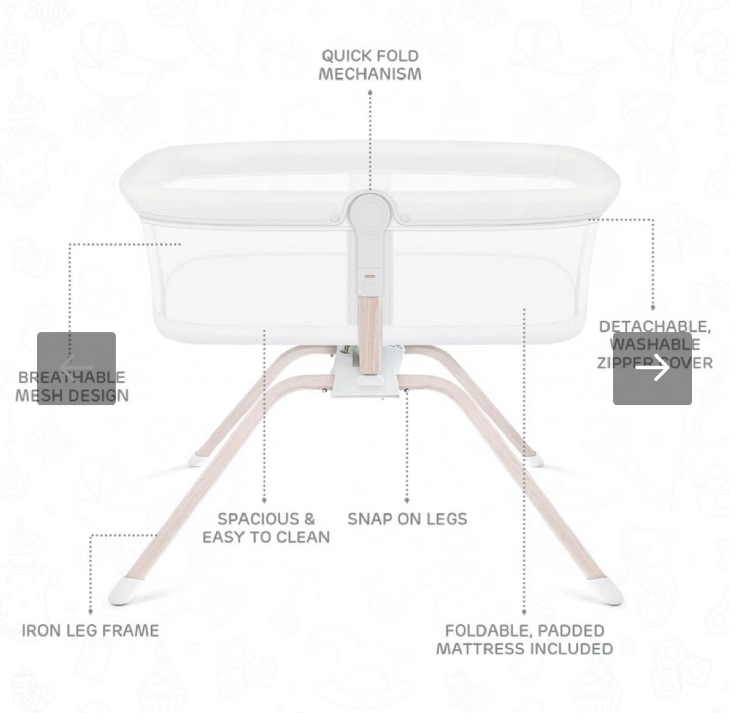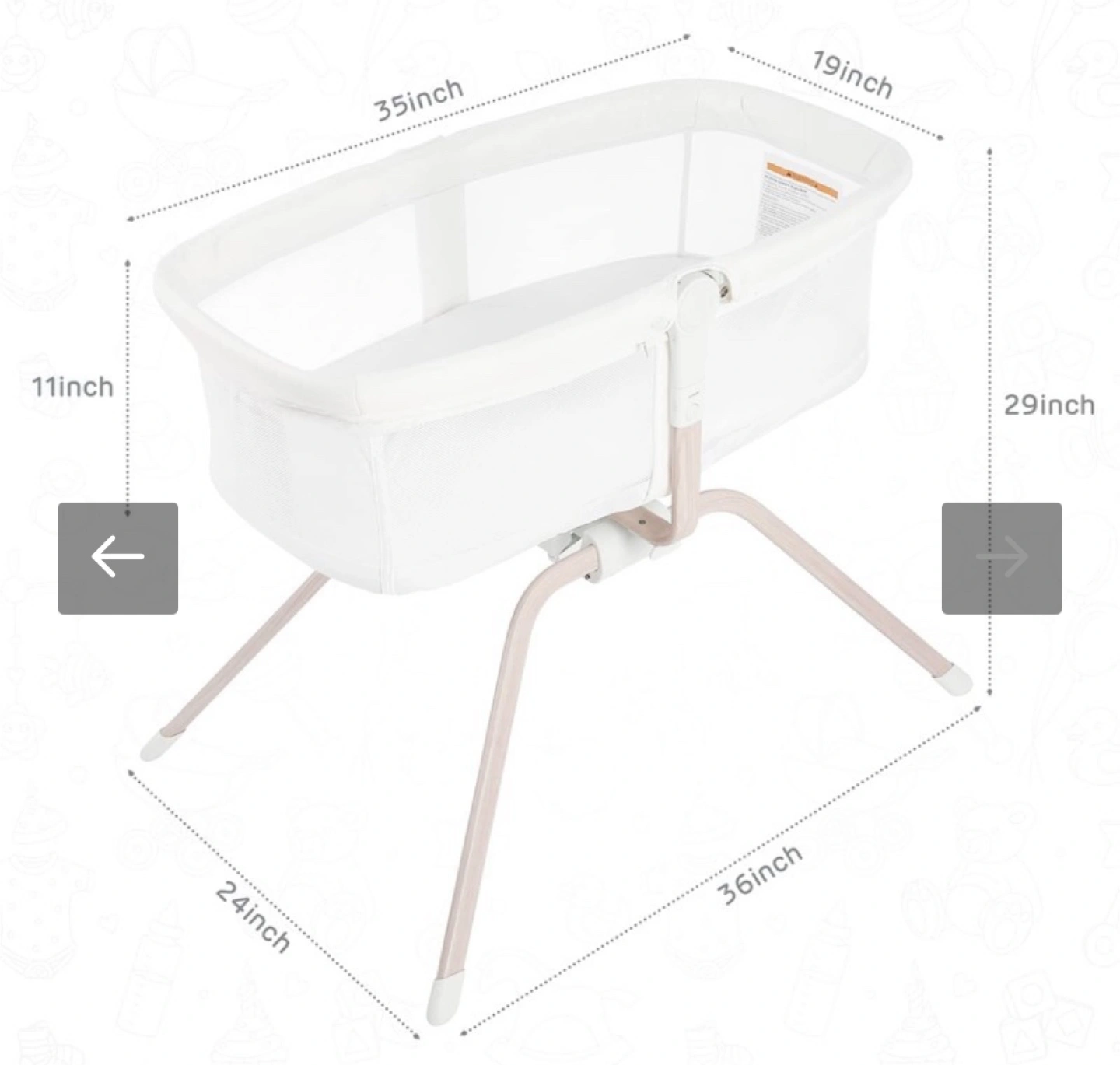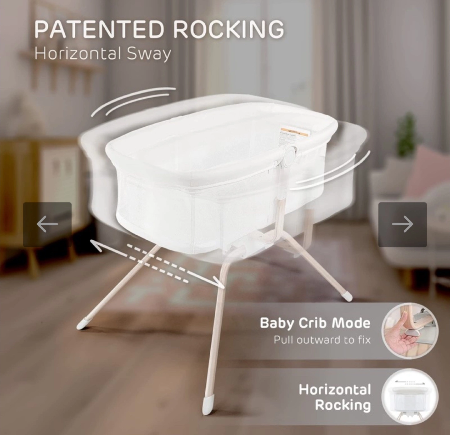 106Baby bassinet, three functions: stationary, rocking and folds for storage. Breathable mesh sides. Includes padded mattress. Suitable for newborns up to 6 months or 30 lbs. Lightweight and easy to assemble.