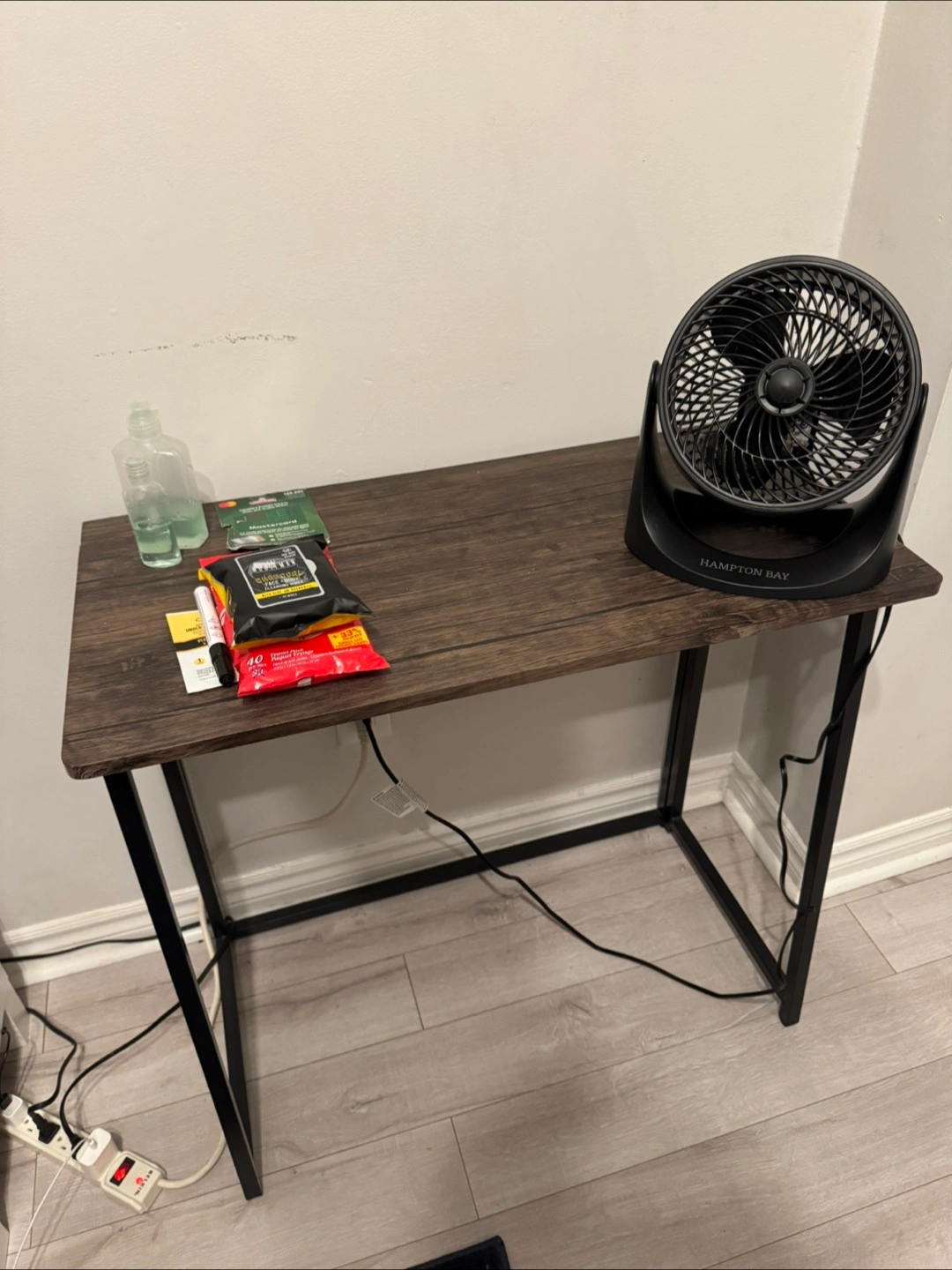 Small folding computer desk. Rustic brown wood-look top. Black metal frame. Easy to fold and store. Perfect for small spaces.