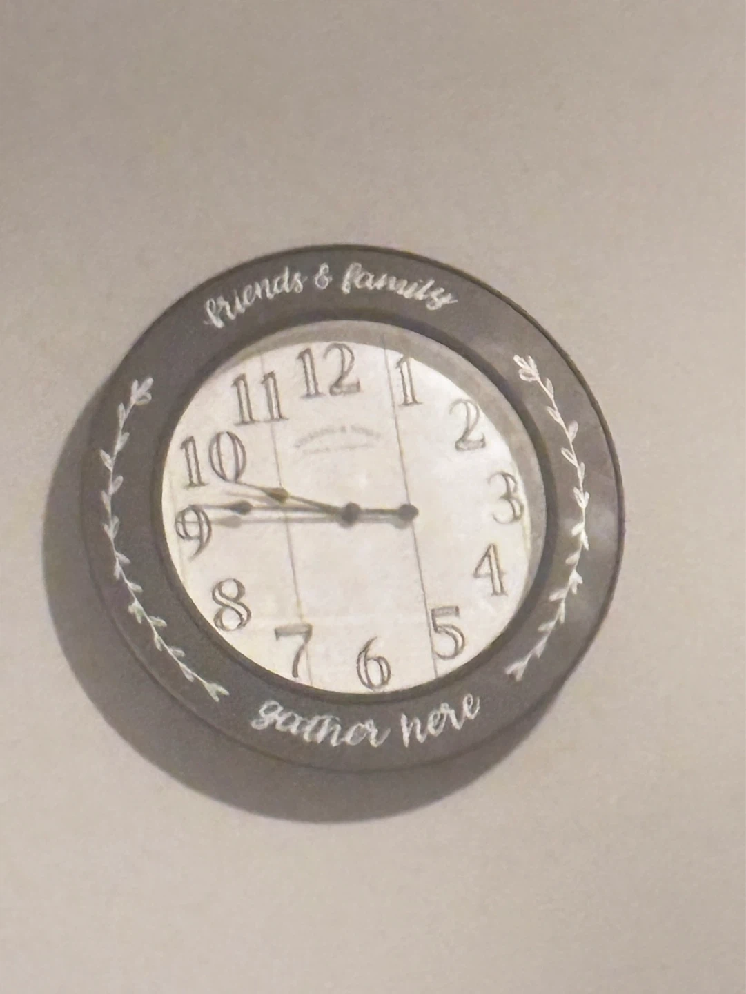This decorative wall clock features the phrase 'Friends & Family Gather Here'. It has a dark-colored frame and a light-colored face with clear numbers and hands. It's a nice addition to any living space.