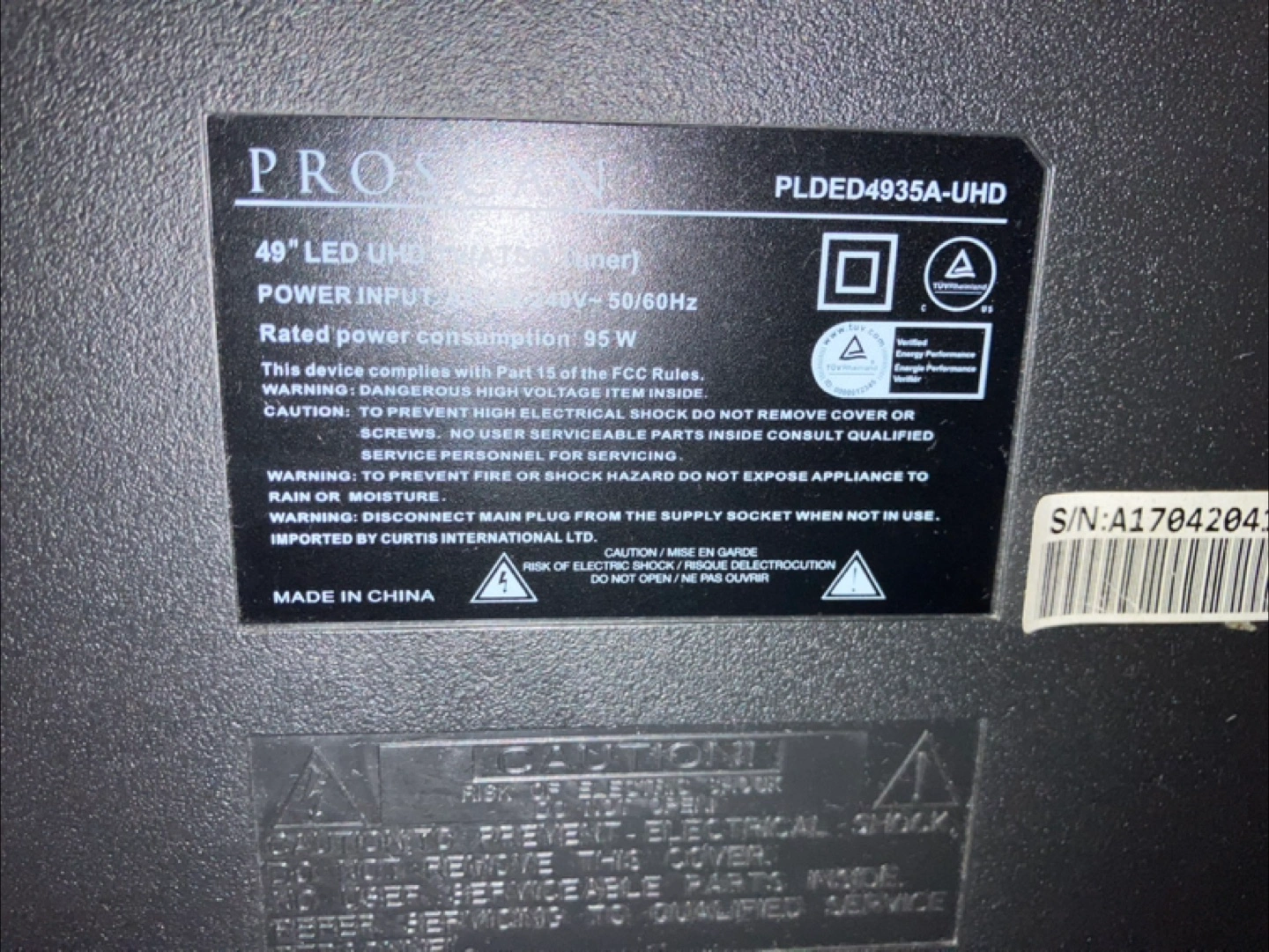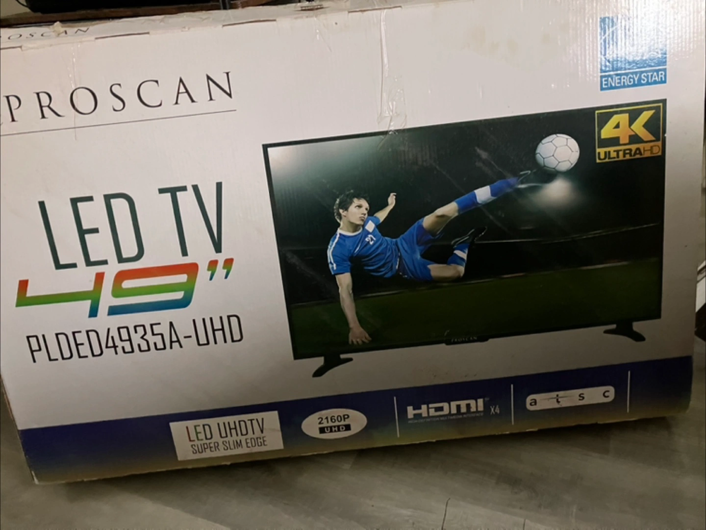 49-inch Proscan LED TV. 4K Ultra HD resolution. Energy Star certified. Slim design. Includes power cord. Multiple HDMI ports. Pre-owned.