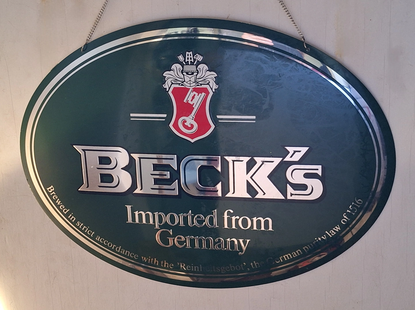 Oval-shaped mirrored metal sign with Beck's logo and text. Hangs from fine chain. Imported from Germany.