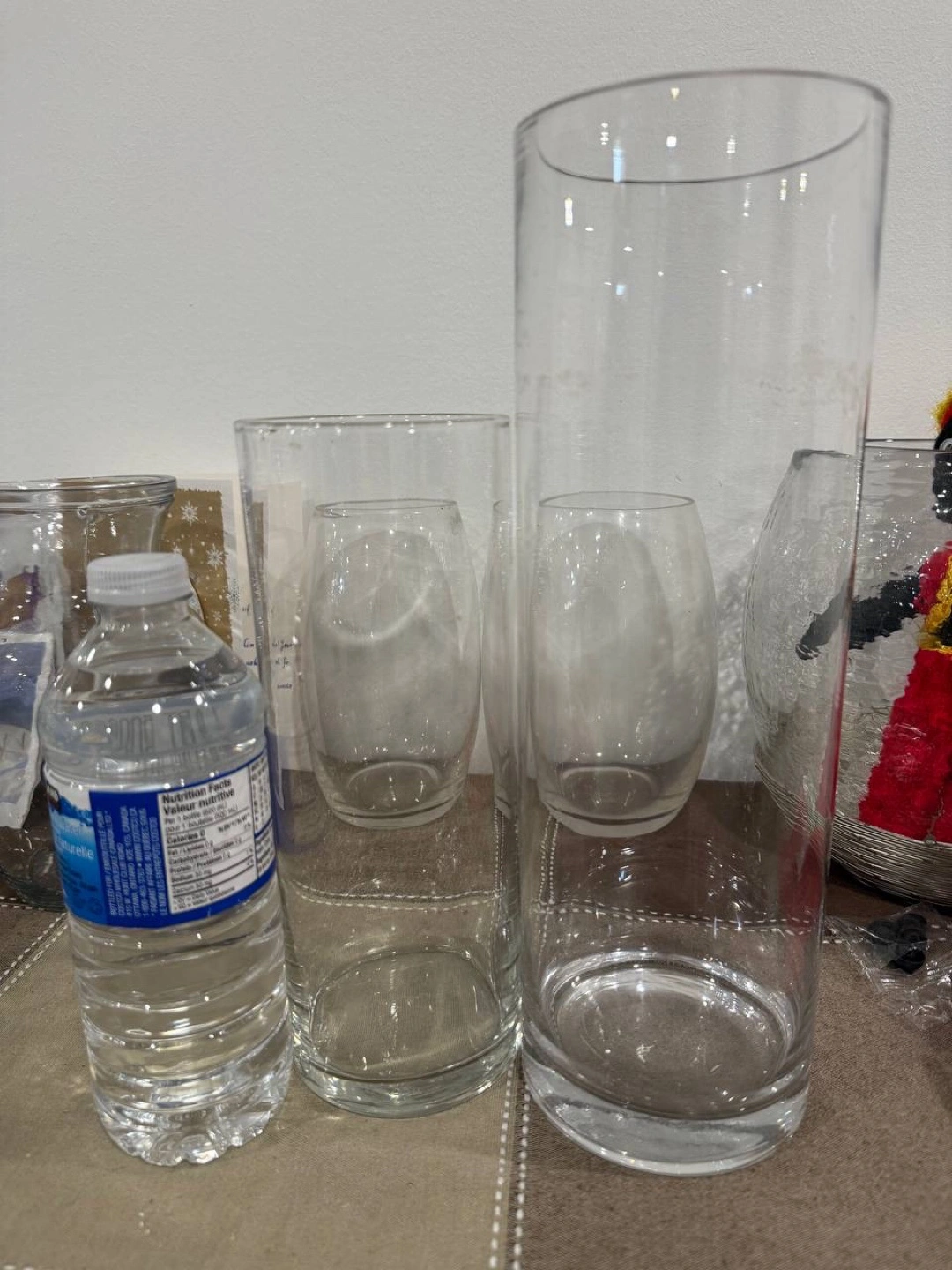 Two size clear glass cylindrical vases, varying heights. Perfect for home decor or event styling. Unbranded.