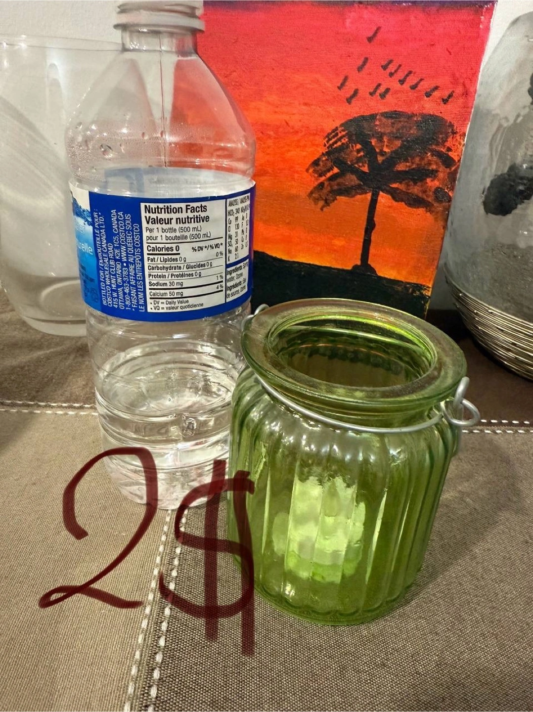 Small green glass jar with a wire handle. Perfect for candles or other small decorative items. Gently used.