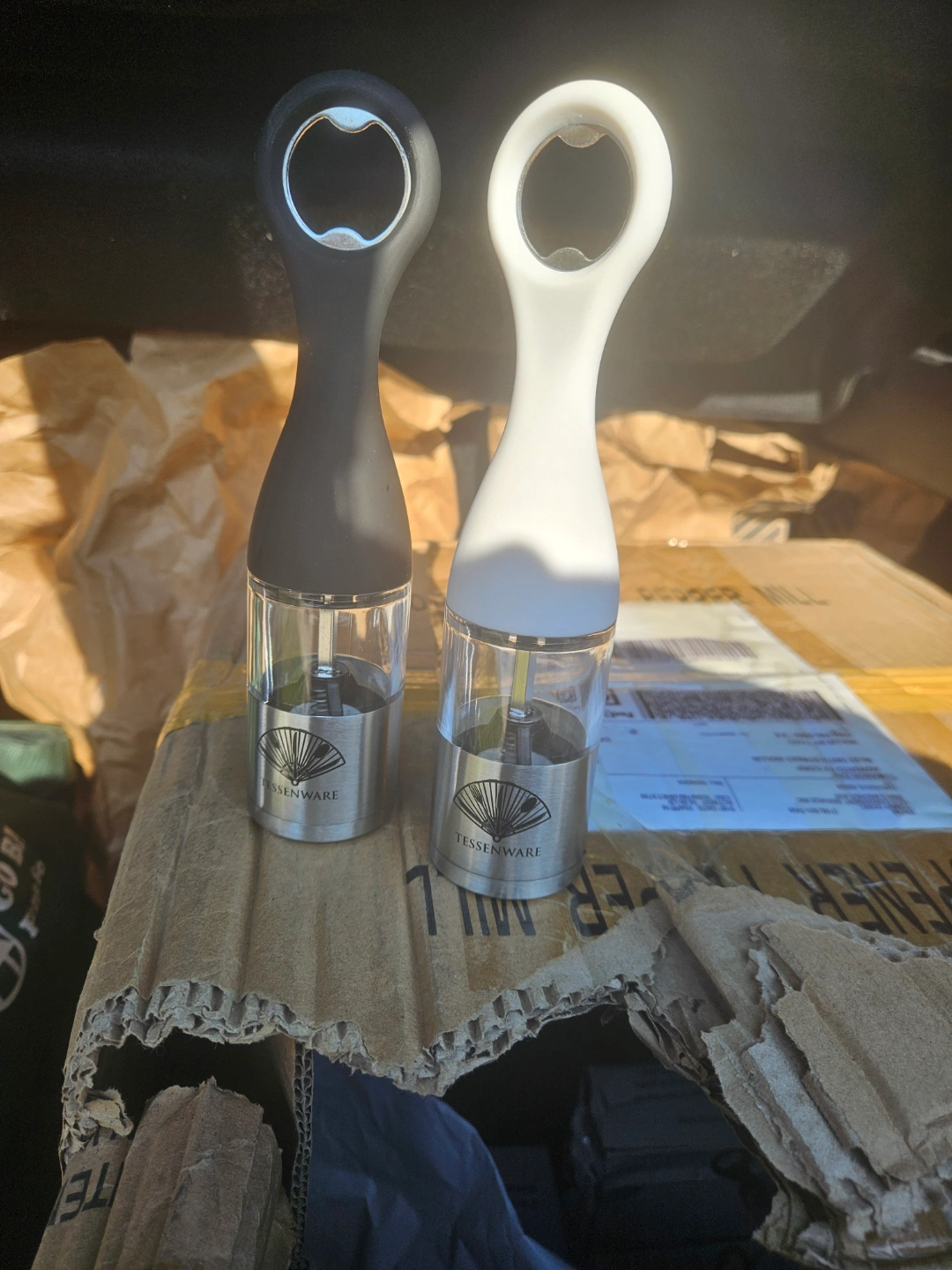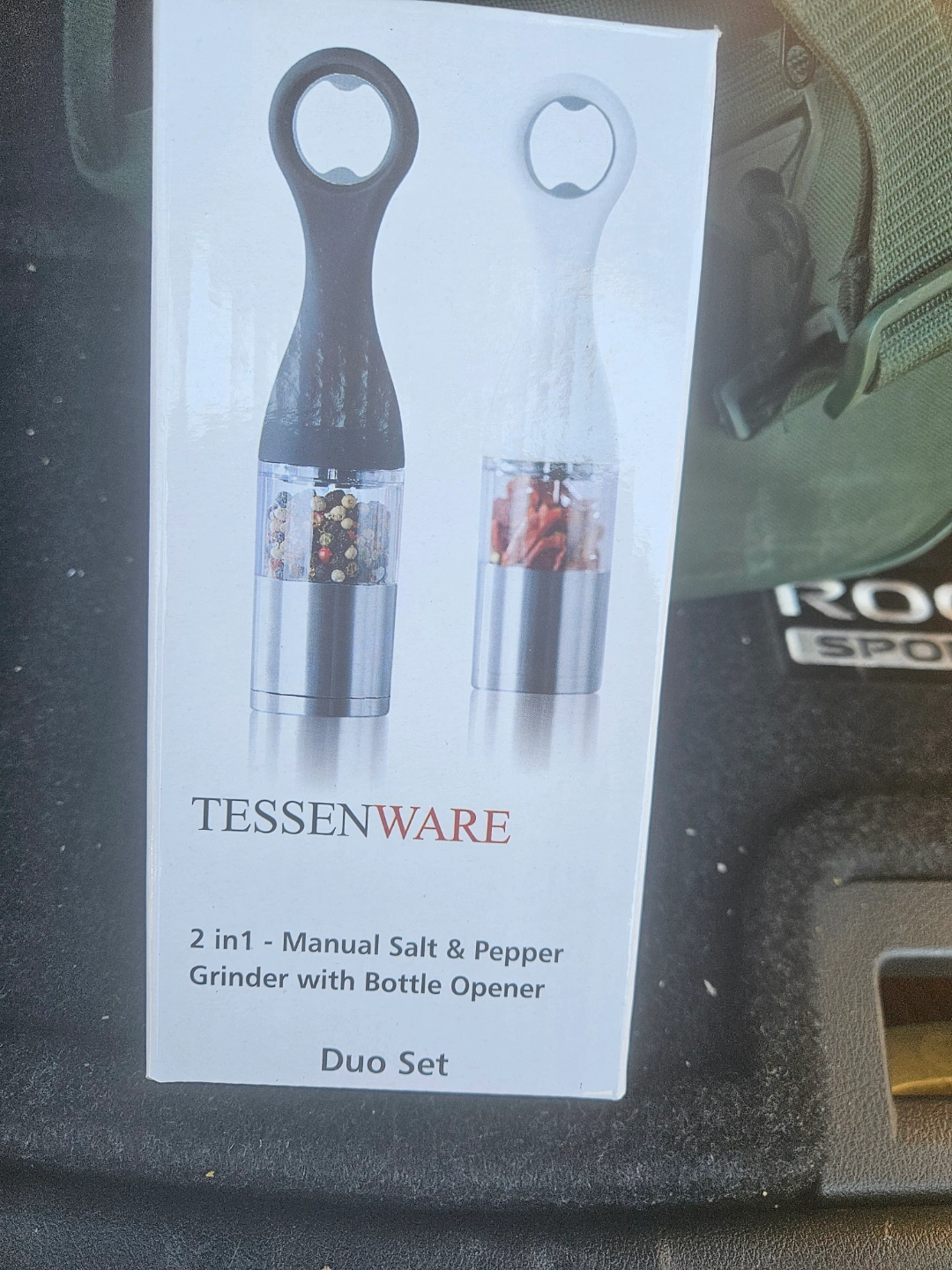 New in box. Two-piece salt and pepper grinder set. Each grinder features a bottle opener. Adjustable grind mechanism. BPA free and made with food grade materials.