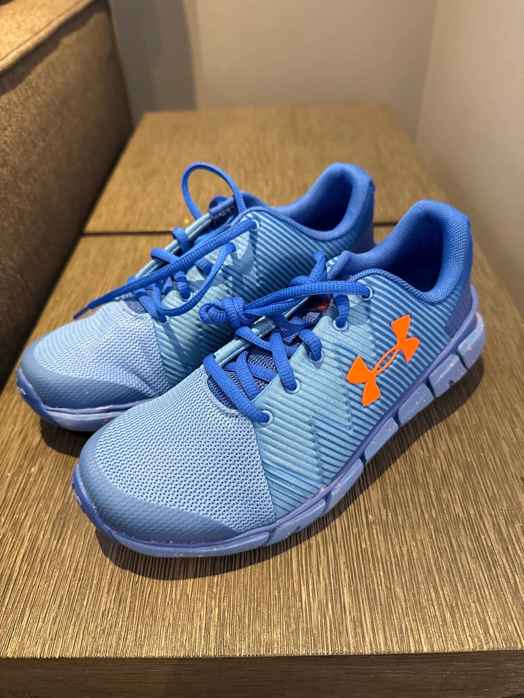 New, never worn Under Armour boy's running shoes. Blue colour with orange accents. Great for various activities. Size 5.5Y.