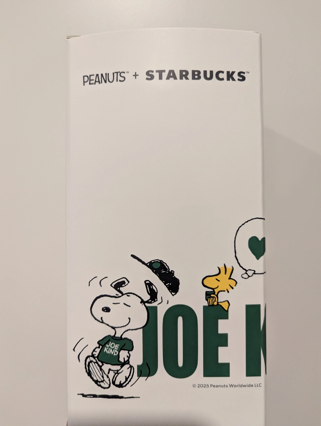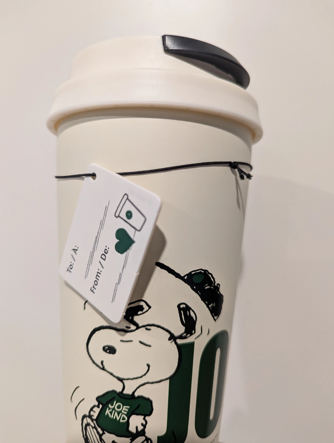 Reusable cold cup featuring Snoopy. Collaboration between Starbucks and Peanuts. Comes in original box. Perfect for coffee or other cold beverages.