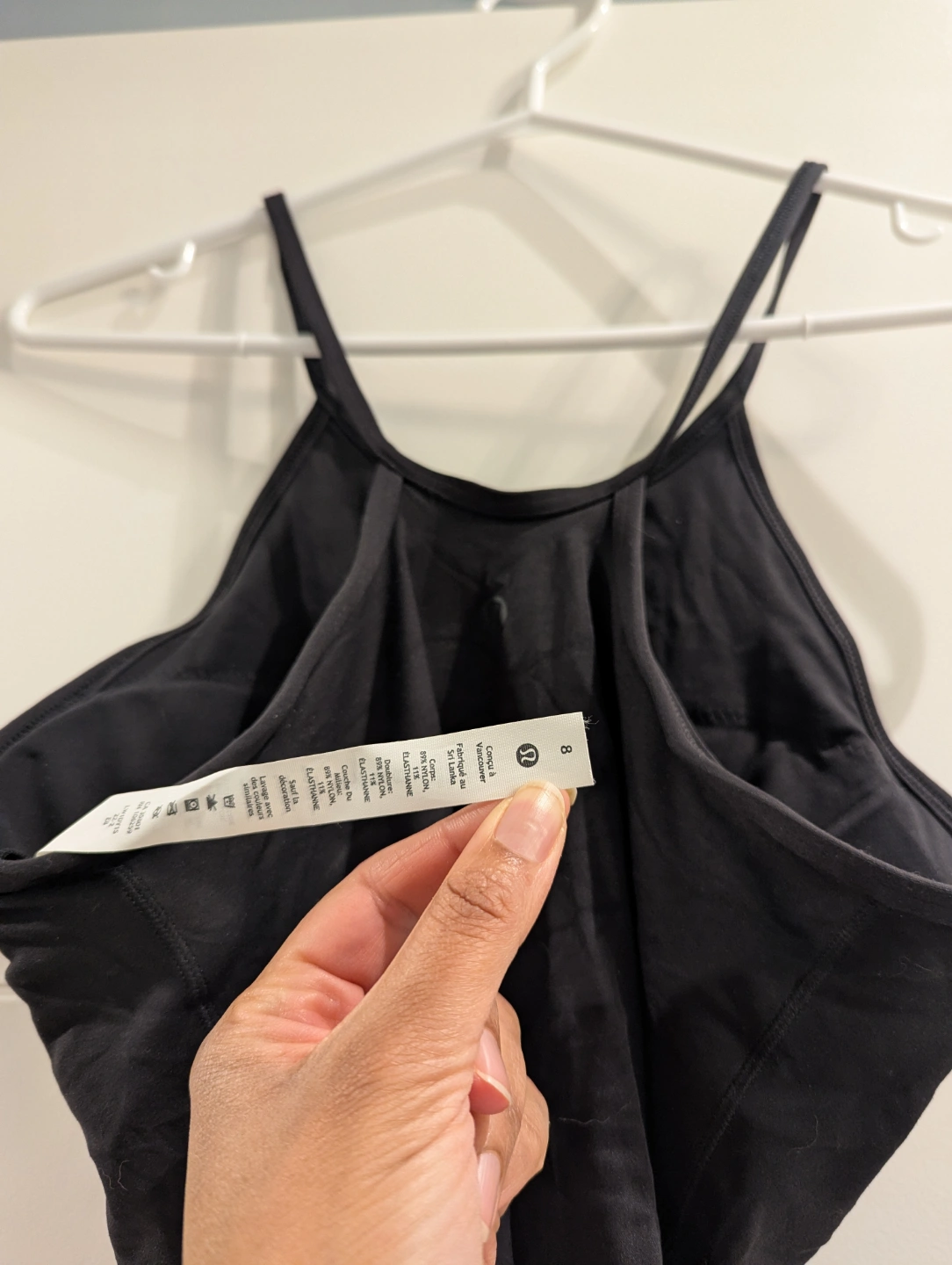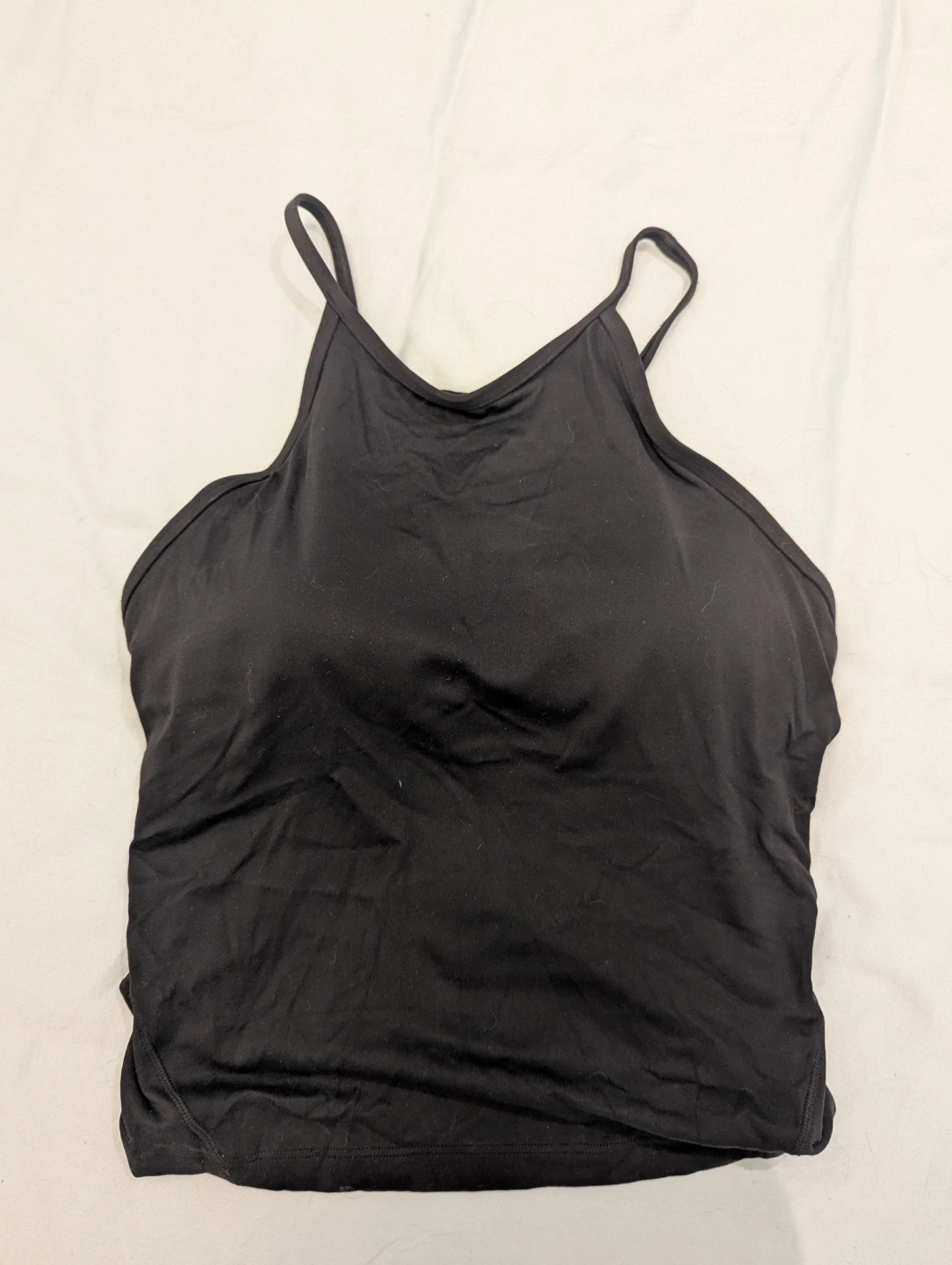 Black cropped tank top. High neckline and thin straps. Size 8. Great for layering or wearing alone.