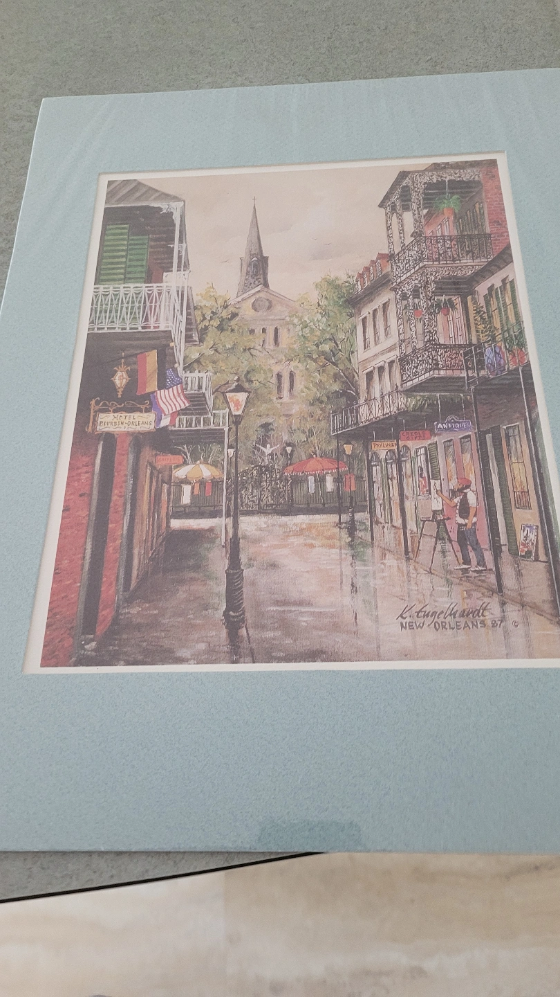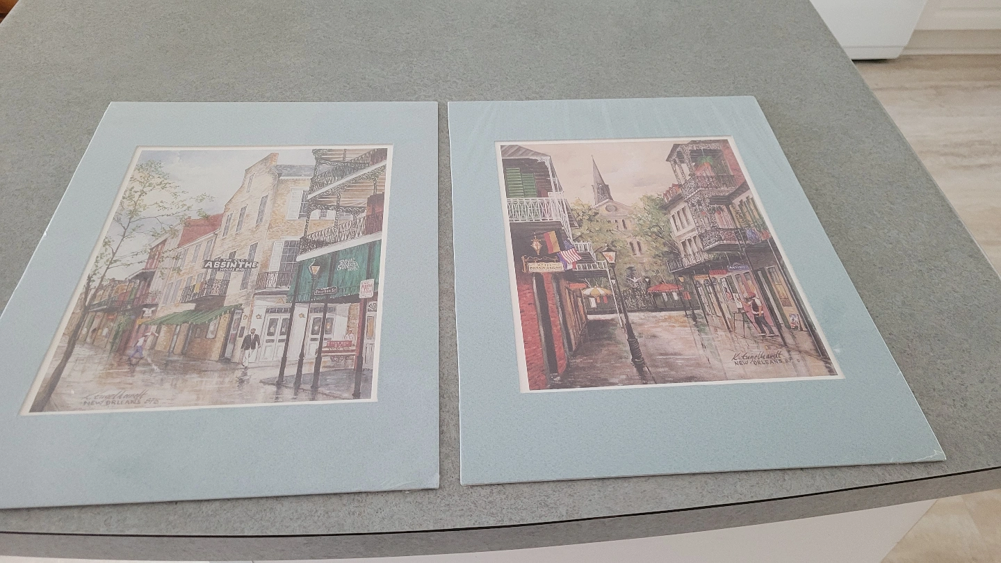 Two framed prints depicting New Orleans streets. Artist signature visible. Light blue mats. Information about the artist and locations included.
