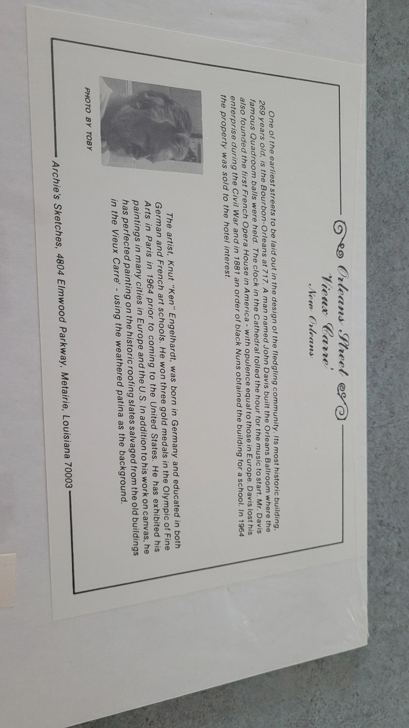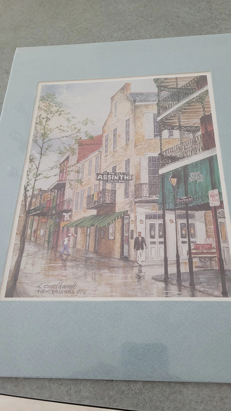 Two framed prints depicting New Orleans streets. Artist signature visible. Light blue mats. Information about the artist and locations included.