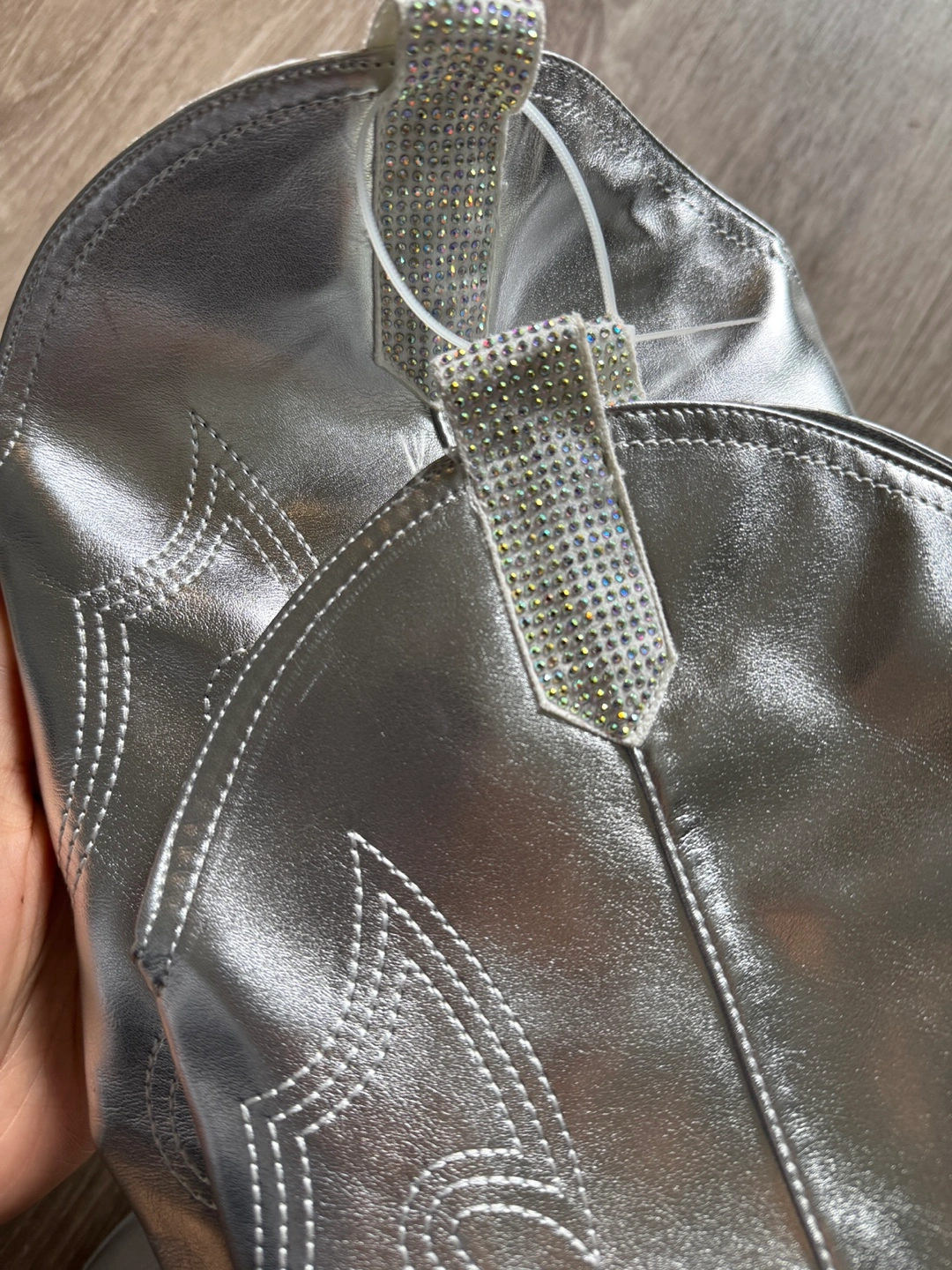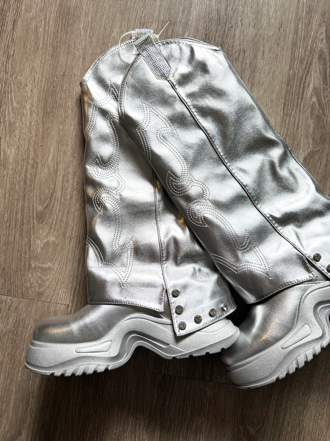 Knee-high silver metallic cowboy boots. Features chunky platform soles and rhinestone accents. Embroidered details on the shaft. Size 10. Pickup on Chandler Drive