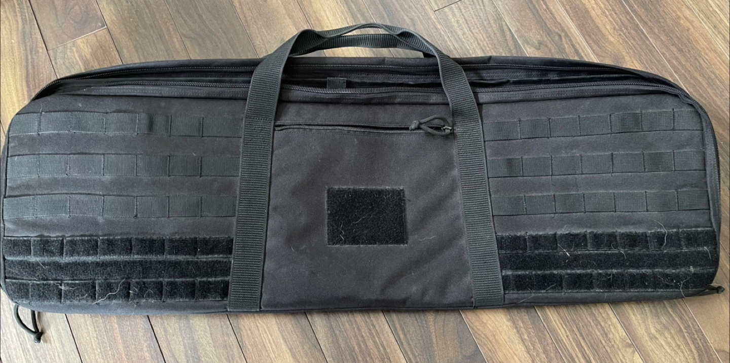 Picture 1: Front of rifle bag has a large pocket with Velcro stripes for patches