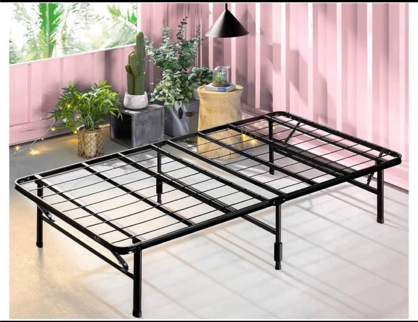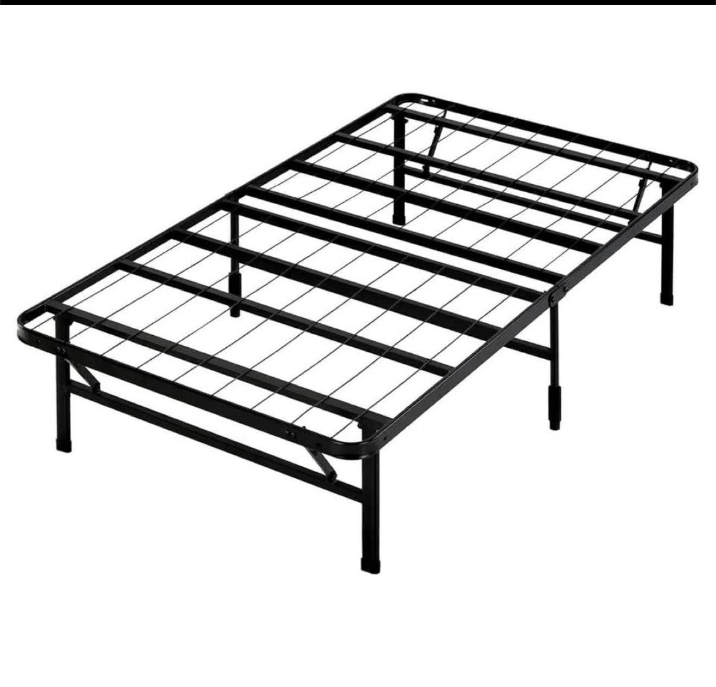 Sturdy metal bed frame, twin size. Supports up to 750 lbs. Features ample under-bed storage space. Easy assembly.