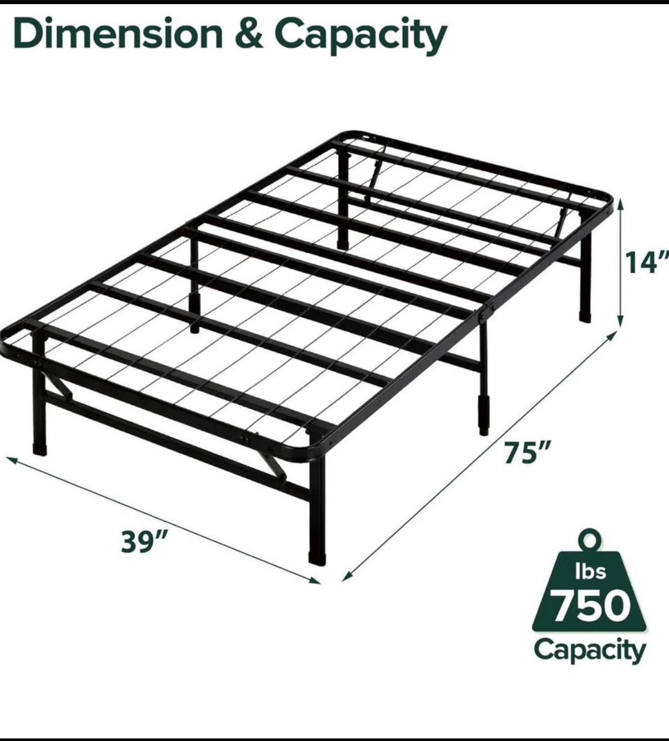 Sturdy metal bed frame, twin size. Supports up to 750 lbs. Features ample under-bed storage space. Easy assembly.