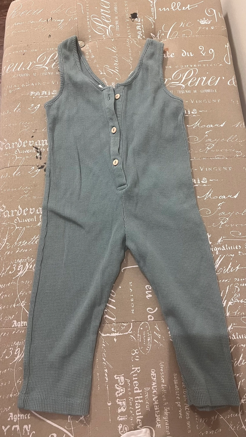 Adorable baby jumpsuit. Features a waffle knit texture and button closure. Sage green colour.