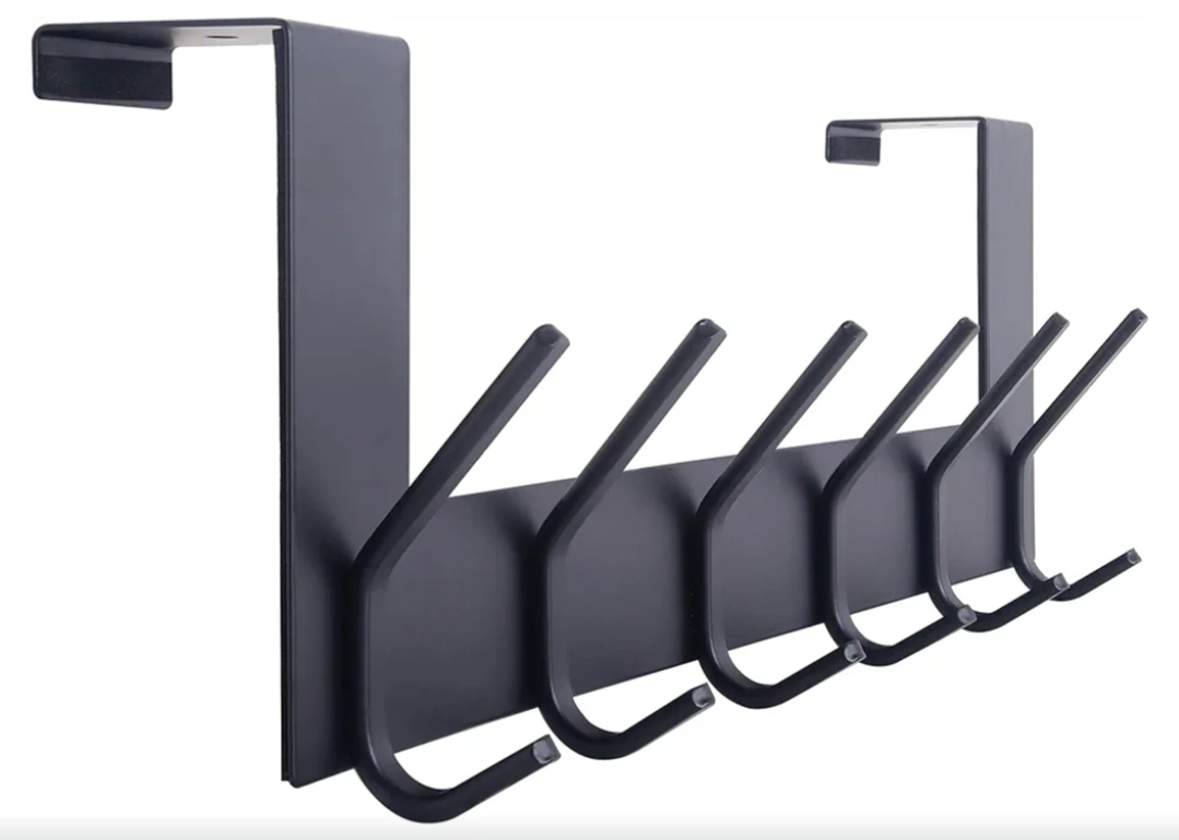 85Black metal over-the-door hook rack. Features six sturdy hooks. Ideal for entryways, closets, or bathrooms. Organize your belongings.