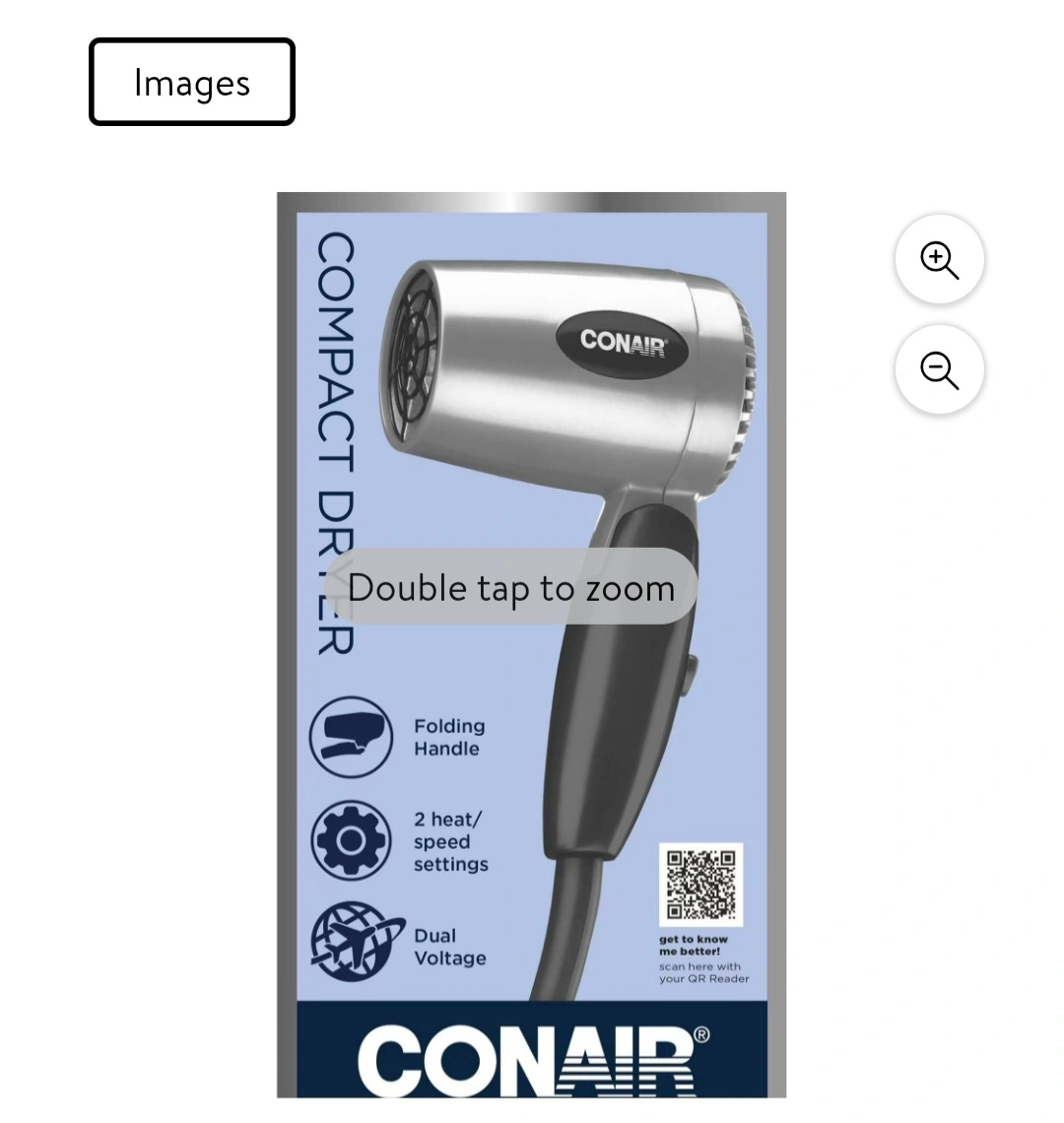85Conair compact hair dryer. Features a folding handle, dual voltage, and two heat/speed settings.